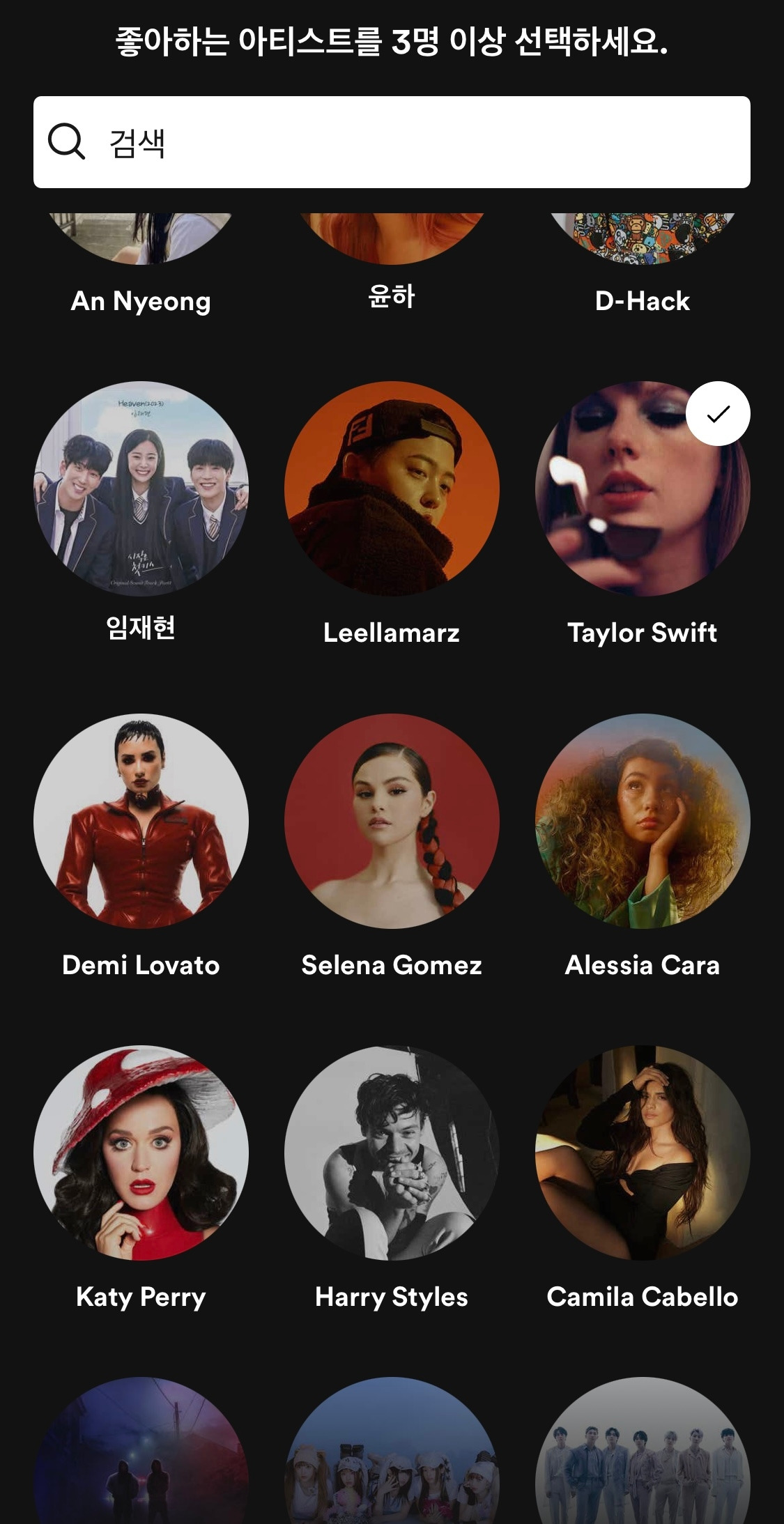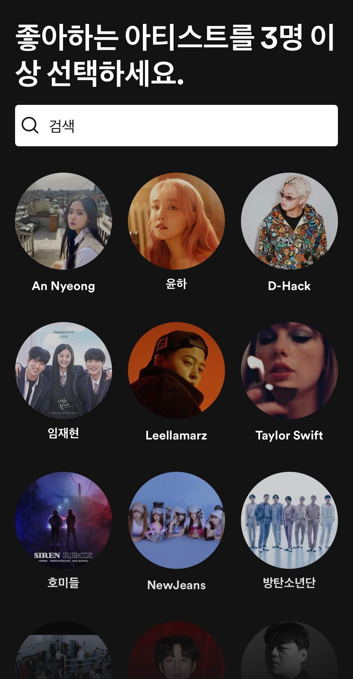그렇다면 스포티파이는 어떻게 유저의 취향을 반영할까? 물론 알고리즘에 의해 취향을 반영하기도 하겠지만, 좀 더 직접적으로 가입 직후 유저의 취향을 물어본다. 좋아하는 아티스트를 3명 이상 필수적으로 선택해야 하고, 한 아티스트를 선택하고 나면 밑에 유사한 아티스트를 더 추가해주는 식으로 리스트가 변경되기도 한다.