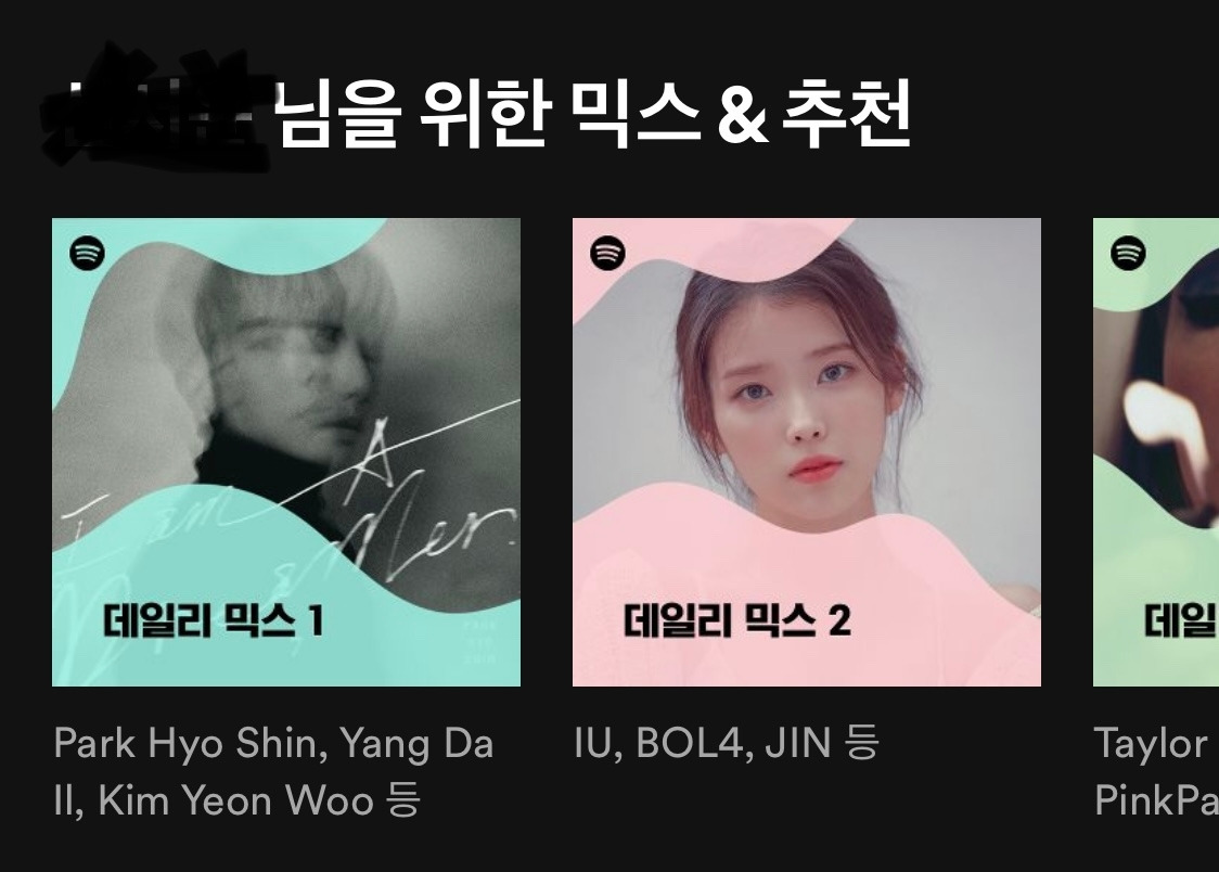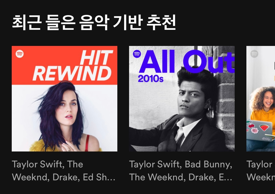 앞서 언급했지만, 번개장터의 경우 처음 가입했는데도 '최근 본 상품과 비슷해요' 등의 추천 탭이 있어 추천에 대한 신뢰도가 떨어질 수 있다고 느꼈다. 스포티파이 또한 첫 가입임에도 불구하고 '최근 들은 음악 기반 추천'이 뜨긴 했지만, 적어도 내가 선택한 가수가 포함되어 있는걸 확인하니 이질적이라는 느낌은 들지 않았다.