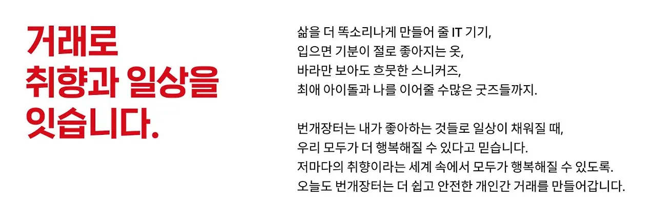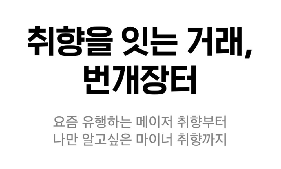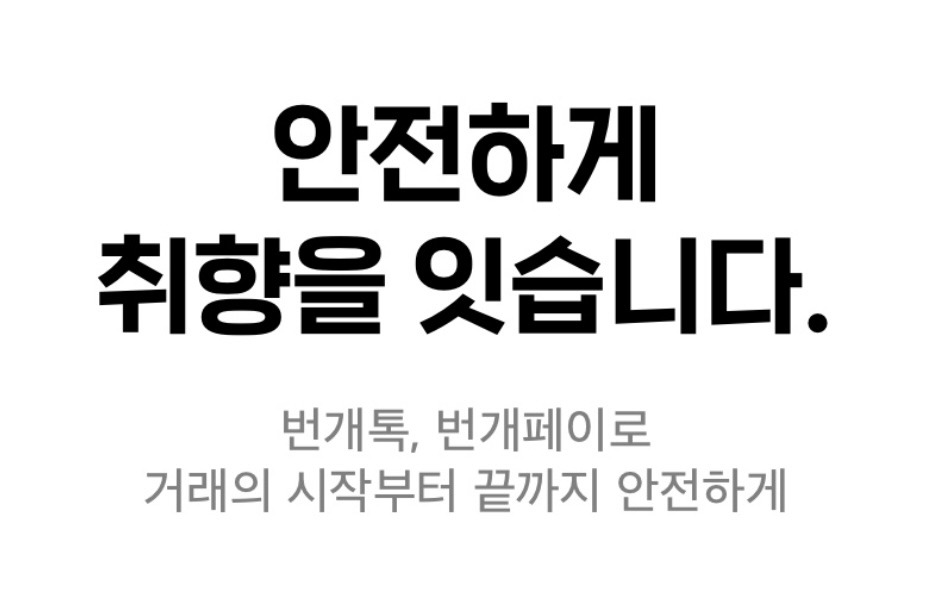 홈페이지와 로그인 화면에서의 소개에서 '취향'과 '안전'이 주요 키워드로 반복되었기 때문에, 이 두가지가 바로 번개장터가 나아가고자 하는 방향임을 알 수 있었다.