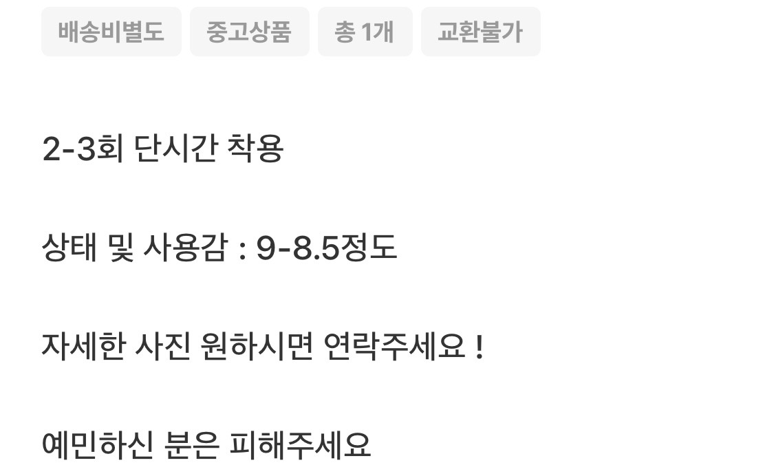 우선 번개장터는 의류/스니커즈를 주축으로 성장하고 있다. 실물을 보지 않고 의류/스니커즈를 구매할 때 가장 필요한 정보는 사이즈라고 생각했다. 또한, 상품의 상태에 대한 정보는 대부분의 판매자가 이미 글에 명시하고 있음을 알 수 있었다. 물론 이러한 설명과 상세 사진을 첨부하도록 유도하는 절차를 만들수도 있겠지만, 매 상품마다 이 과정을 반복하도록 한다면 사용성이 저하될 수 밖에 없기 때문에, 더 고려해 볼 부분이 많다고 생각했다.