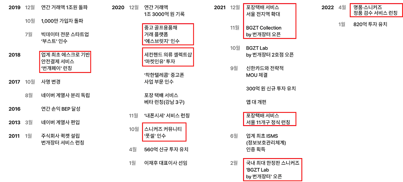 실제로 번개장터의 연혁을 살펴보니, 번개장터가 어떻게 '취향'과 '안전'이라는 키워드 아래 성장 전략을 세우고 있는지 알 수 있었다.