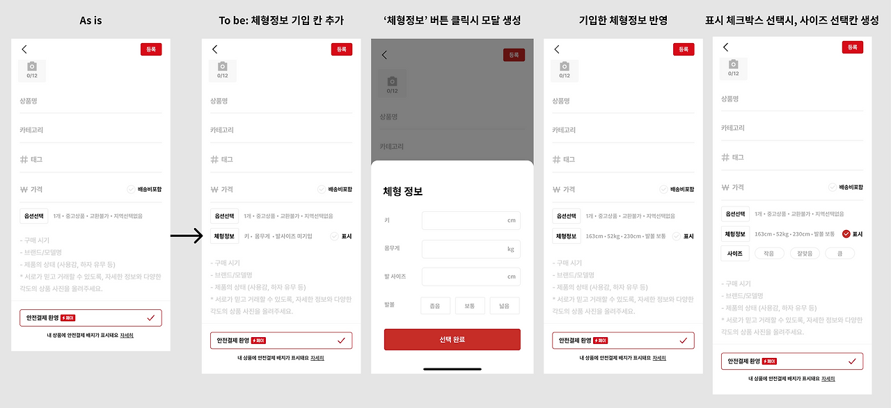 번개장터 또한 유일한 정보 제공자인 판매자가 상품 등록 단계에서 본인의 체형과 발사이즈, 발볼 정보를 기입할 수 있도록 개선했다.