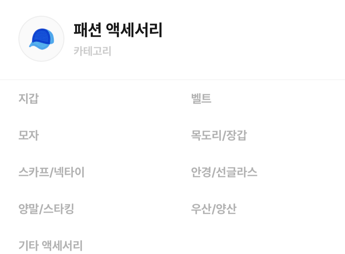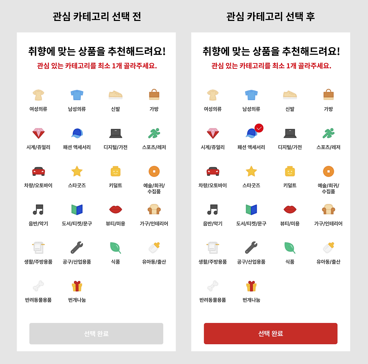 번개장터 또한, 현재 제공하고 있는 카테고리 분류를 활용해 이러한 취향 선택 페이지를 만들수 있을 것이다. 해당 페이지는 가입 직후 홈 화면으로 넘어가기 전 노출되며, 유저는 필수로 하나의 카테고리를 선정해야 한다.