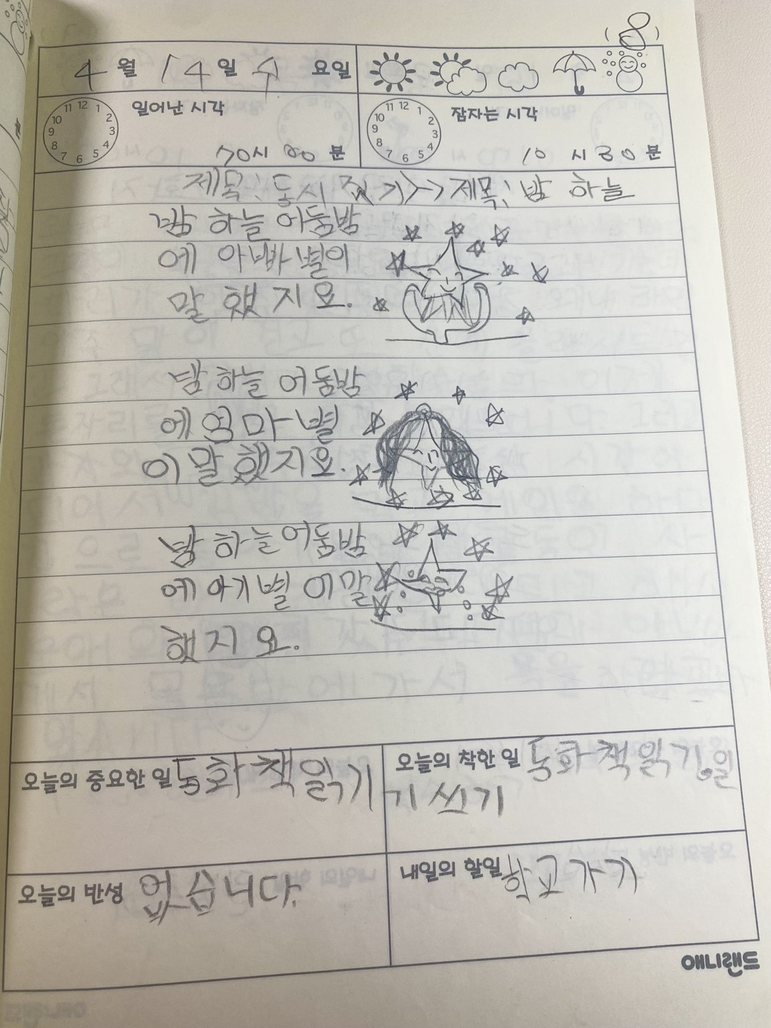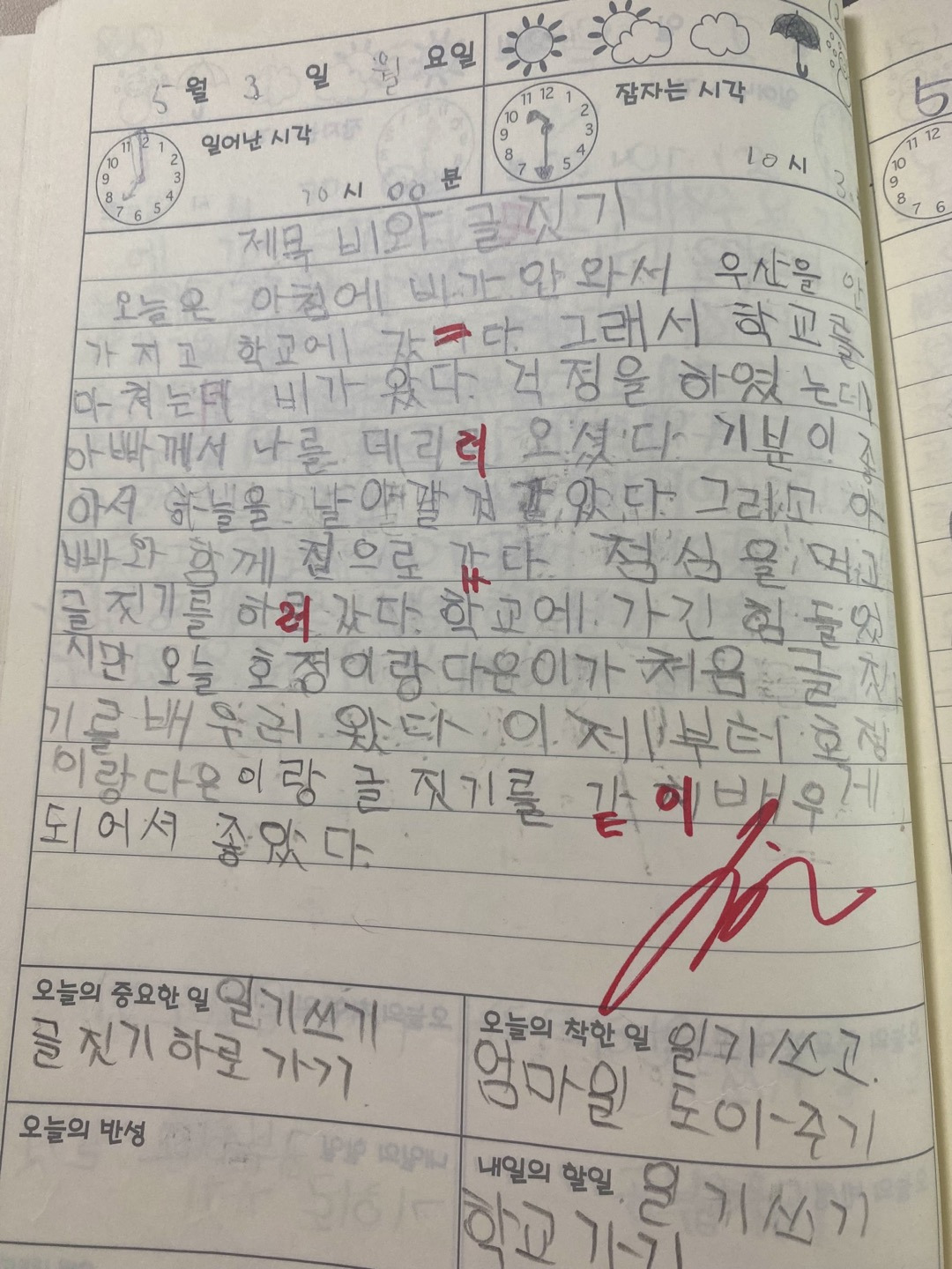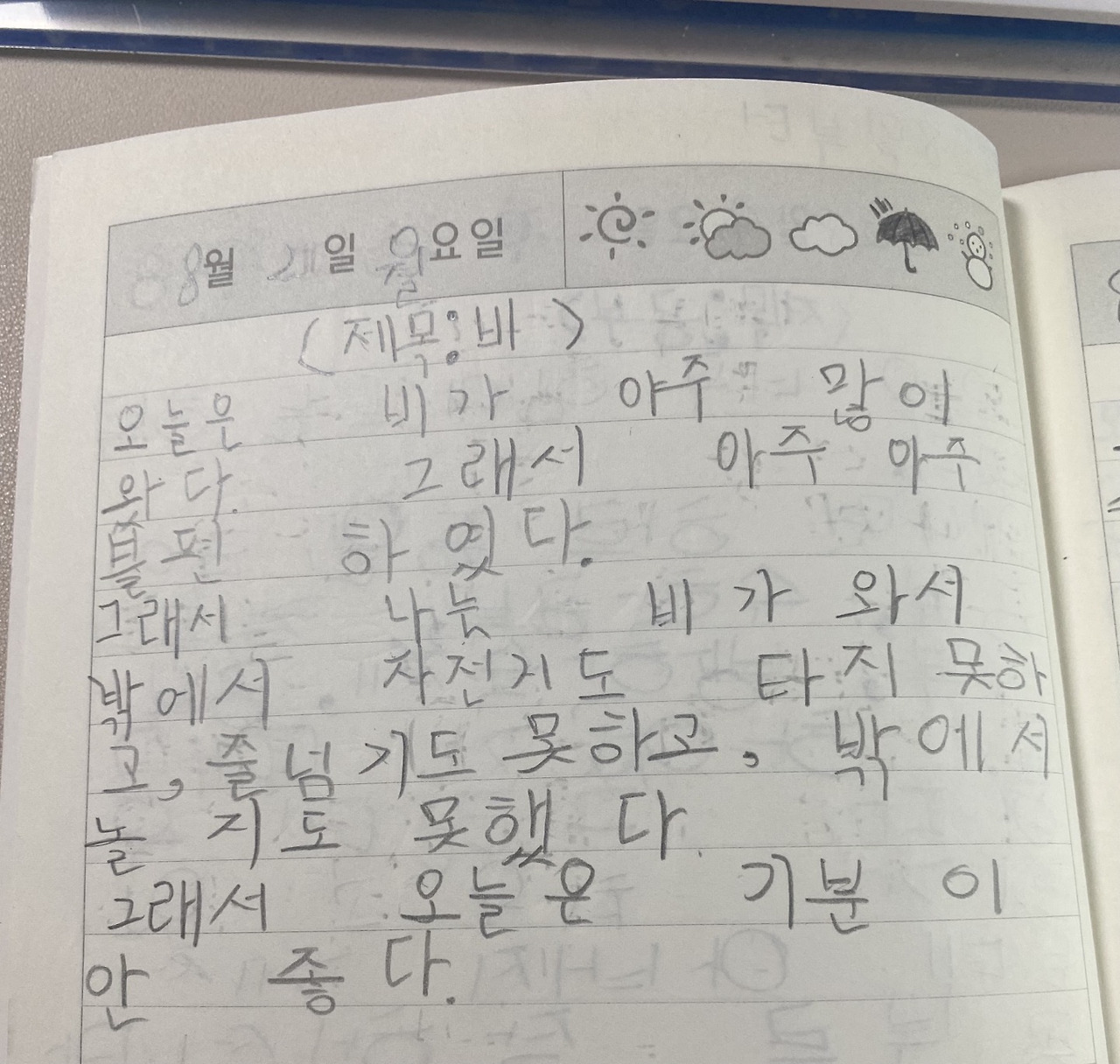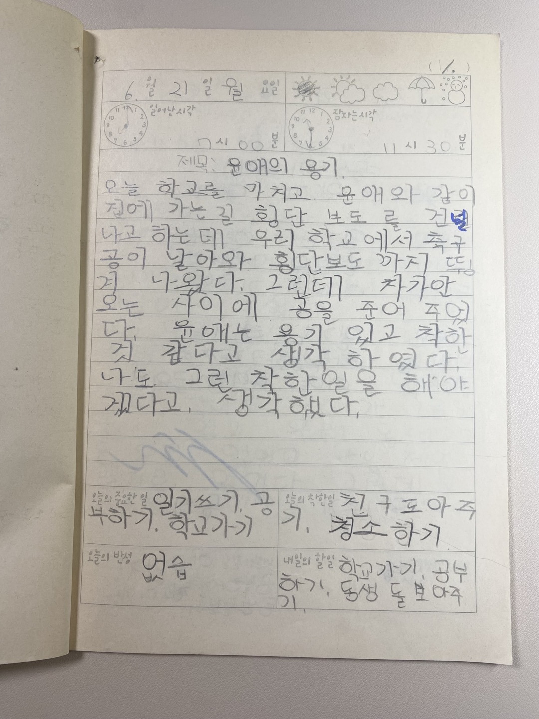 일기장에 날씨 얘기가 태반이다. 나가서 뛰어놀아야 하기 때문이다. 심지어 내일의 할 일은 신나게 놀기다. 나는 가만히 앉아서 공부하는 것보다는 밖에서 뛰어노는 것을 좋아한 활동적인 아이였구나. 새삼 깨달을 수 있었다.