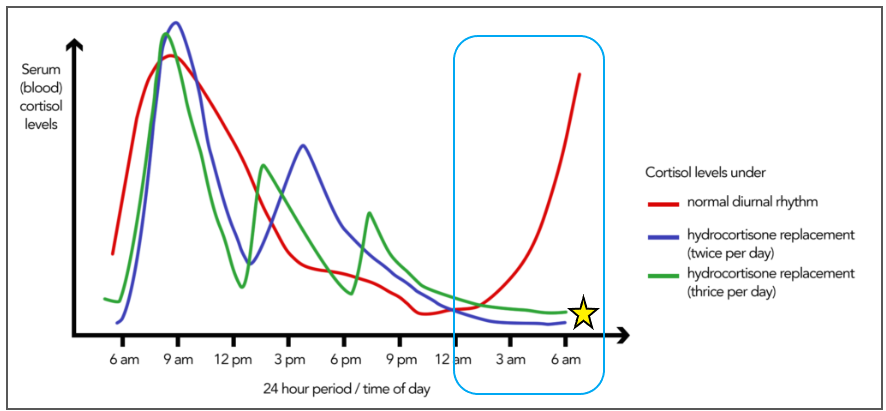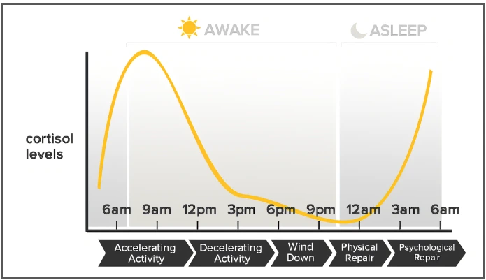 코르티솔은 전반적인 건강 유지에 중요한 호르몬이다. 조금 깊이 들어가면, 뇌하수체에서 분비되는 부신피질자극호르몬(ACTH)이 부신피질에 신호를 보내 코르티솔 생성을 명령한다. 코르티솔 수용체는 거의 모든 세포에 존재하고 이 호르몬의 대표적인 역할은 체내 혈당을 높이고 탄수화물과 지방의 대사를 돕고 염증을 조절하는 등 여러 가지 작용을 한다. 중요한 포인트는 하루 중 코르티솔 수치가 변하는데, 일반적으로 체내 코르티솔 수준은 새벽 2시부터 서서히 증가하기 시작해 오전 6~8시 사이에 최고조에 도달한다.