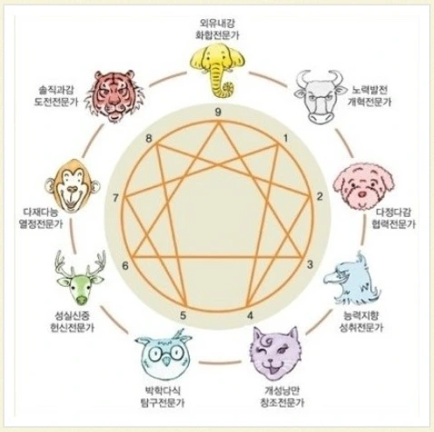 1에서 9까지의 숫자로 명명된 9가지의 유형은 3가지 힘의 중심에서 세분화된 에니어그램의 기본 유형이다. 각 숫자에 좋고 나쁜 가치가 부여되어 있지는 않다. 각 유형별로 대표하는 동물과 별칭이 있는데 찰떡같이 잘 어울려 이해가 더욱 쉽다.