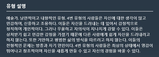 4번의 에너지가 가장 강한 경우 감정이입에 탁월하기에 타인의 정서를 읽거나 공감하는 데에도 능하지만, 자신의 정체성을 찾는 것에 더욱더 큰 에너지가 향한다고 한다.