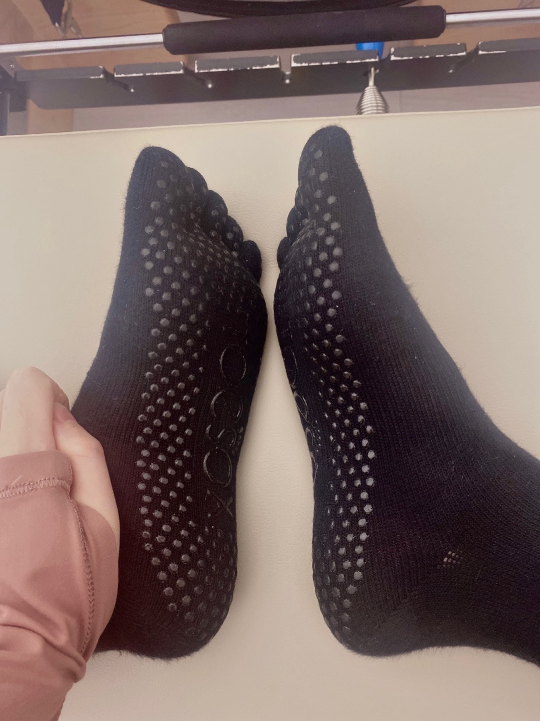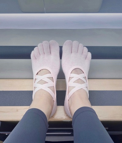 맨발로 수업을 듣는 회원들도 꽤 많은데, 되도록이면 자신에게 딱 맞는 발가락 양말을 신는 것이 가장 좋겠다. 기구들을 발로 잡고 걸치고 하는 동작이 많기 때문에 위생면에서도 그렇고, 굳은살이나 부상 방지용으로도 양말을 착용하는 것을 특히 추천한다.