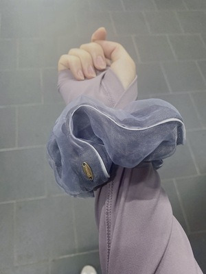 딱딱한 스크런치 말고 어느 정도 포근한 스크런치가 좋다. 하늘을 보고 눕는 동작을 할 때 폭신폭신한 스크런치가 목에 부담이 덜하기 때문이다. 풀릴 수 있는 상황을 대비해서 검은 고무줄을 먼저 한 뒤에 스크런치를 두 번 짱짱하게 돌려 야무지게 똥머리 해준다.