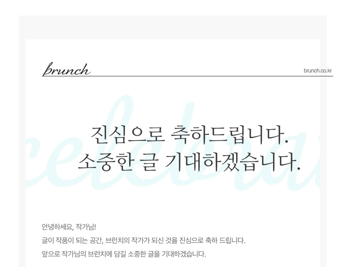 목요일 오전 9시 30분에 작가 신청서를 넣었고, 금요일 오후 5시에 작가 신청 승인 축하 메일을 받아볼 수 있었다. 정말 짜릿하다. 새해를 브런치 작가 합격으로 시작하다니!!! 대개 합격된 사람은 하루에서 이틀 사이로 발표가 나고, 반려된 사람은 조금 더 걸리는 듯하다.