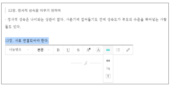 써놓고 보니 글씨체가 마음에 들지 않아 글씨체도 기본이 아닌 다른 걸로 바꿔준다. 글씨체는 드래그하면 다른 체가 보인다. 또 인용구 같은 꾸밈도 다양하게 적용했다.