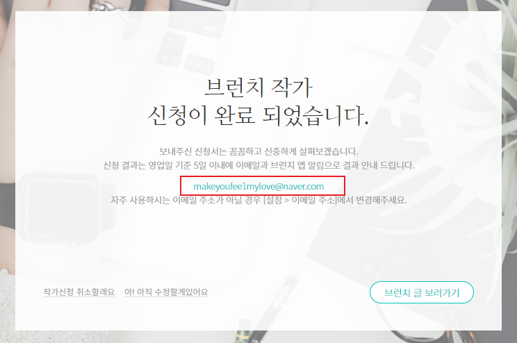 실제로 나는 목요일 오후 2시 30분에 작가 신청을 완료했고, 하루도 안 돼서 다음날인 금요일 오전 11시경에 합격 메일을 받았다.
