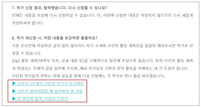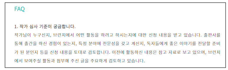 브런치 작가 신청 안내 맨 하단에 FAQ를 잘 살펴보자. 교과서 위주로만 공부했어요처럼 여기에 핵심이 있다.