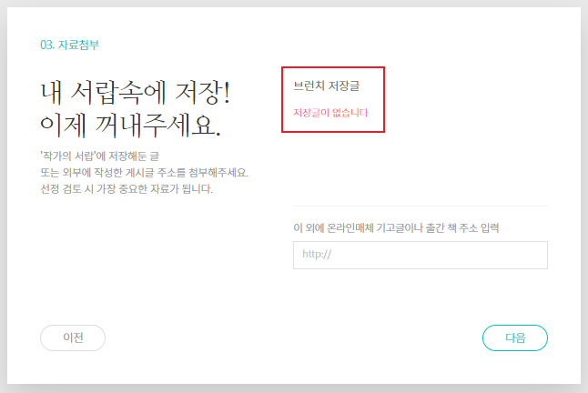 워드 파일에 따로 저장해 둔 01. 작가 소개와 02. 브런치 활동 계획을 복사 붙어 넣기 해주고, 03 자료 첨부에서 브런치 저장 글을 체크박스에 체크해 준다. 자동으로 생성된 3개의 글을 확인할 수 있다.