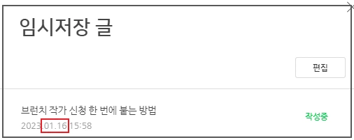 01/14(토)에 작가 신청을 해봐야지 마음을 굳히고, 1/16(월)에 네이버 블로그 포스팅 저장 글을 작성한다. 제목은 "브런치 작가 신청 한 번에 붙는 방법"이다. 물론 내용까지 썼다.