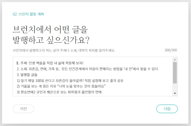 300자가 의외로 굉장히 짧다. 이때도 위의 안내글을 정독한다. 나를 이해시키고, 기대할 수 있도록 알려야 한다. 불필요한 개인 정보는 없어야 하고.