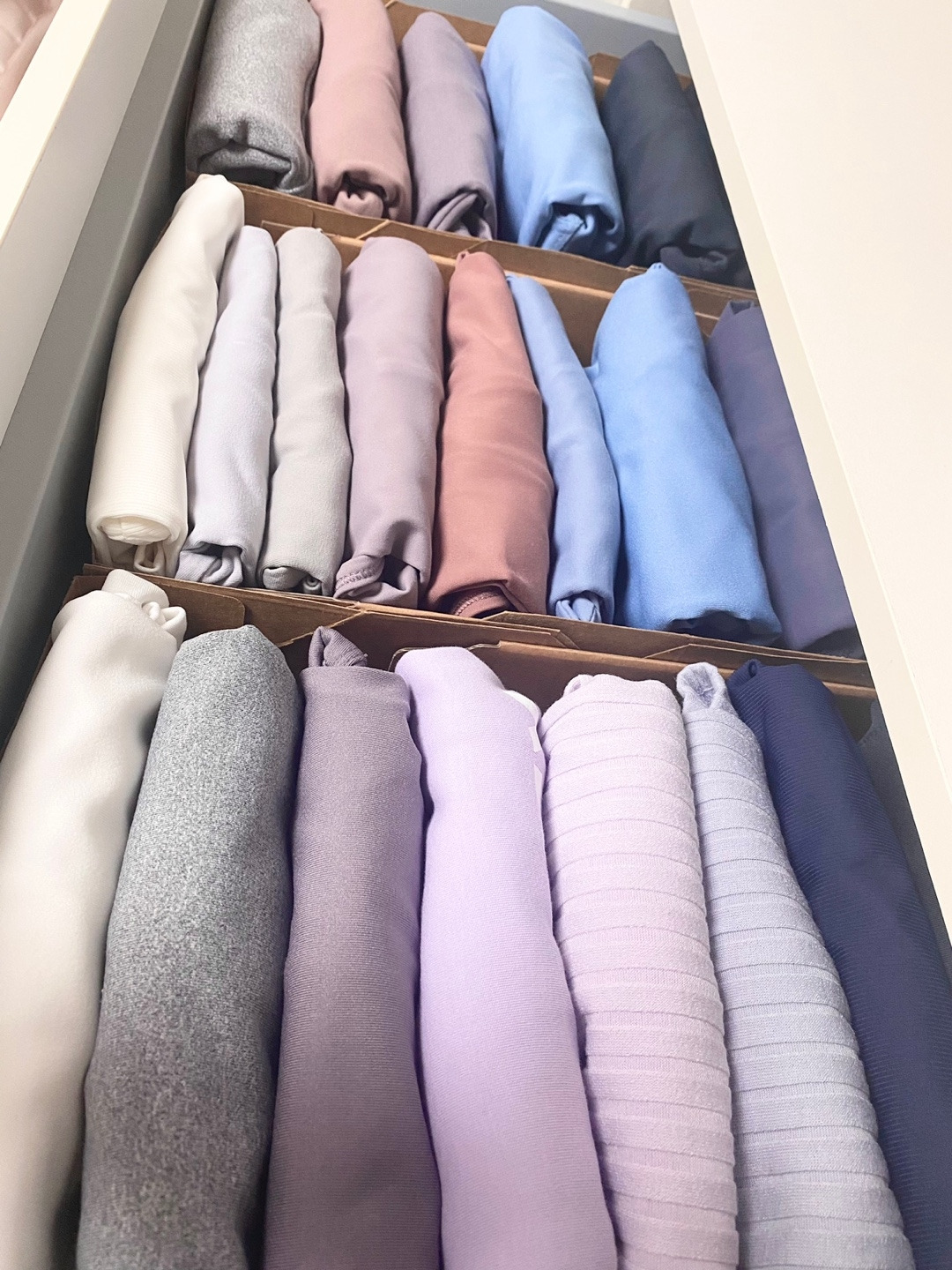 하지만 안타깝게도 정갈한 정리를 다소 방해하는 것이 있다면, 바로 레깅스다. 재질의 특성상 흐물흐물하기 때문에 어떻게 정리를 해도 각이 잘 살지 않기 때문이다. 차곡차곡 개서 올려두는 방법이 있지만, 아래에 있는 레깅스를 입으려고 빼내면 후두두 다 쏟아지는 경우가 빈번하다. 그래도 방법이 다~ 있다!