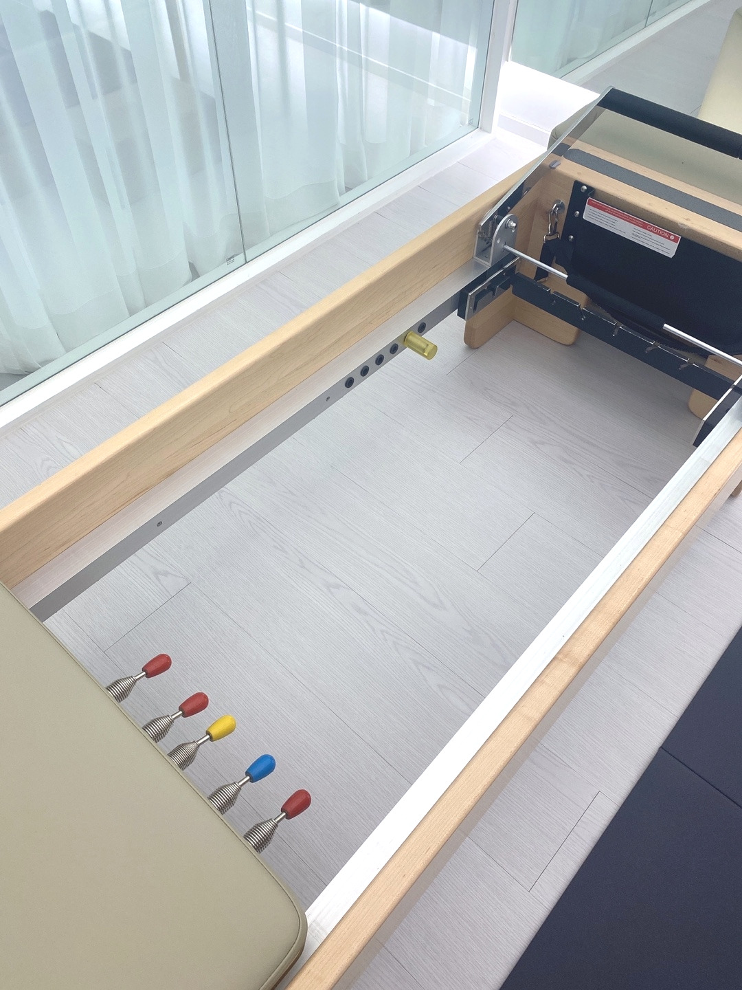 개인의 무게나 운동능력에 따라 강도를 조절할 수 있다. 직관적으로 빨간색은 가장 강한 힘을 가진 스프링, 초록색은 중간 강도, 노란색이 약한 강도다. 안전을 위해 스트링의 몸통을 잡고 스프링 변경을 한다. 빨간색 스프링은 단단하고 무거워 한 손으로 변경이 힘들 수 있다. 두 손으로 잡고 변경해도 좋다. 스프링의 강도는 어떤 동작을 하느냐에 따라 반대로 적용될 수도 있다. 그러므로, 너무 버거워 동작을 전혀 수행하지 못할 정도라면 조용히 손을 들어 강사님에게 스프링 변경을 요청하는 것도 좋다. 자세에 따라 반대로 노란색 스프링이 더 힘든 경우도 있기 때문이다.