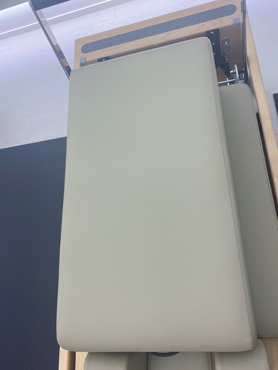 발을 올리는 곳이다. 각도도 조절할 수 있다. 아예 바닥으로 눕힐 수도 있고 위를 향해 올릴 수도 있다. 그때그때 동작에 따라 맞게 풋바의 위치를 조절한다. 네발 기기 자세를 하면 손으로 잡는 부분이기도 하다.