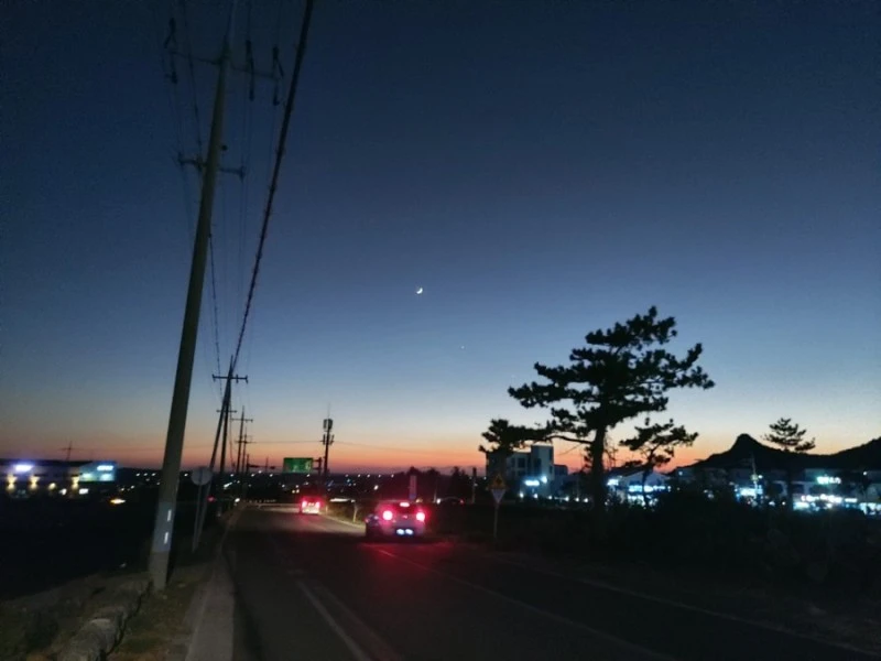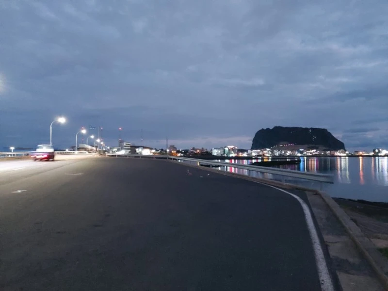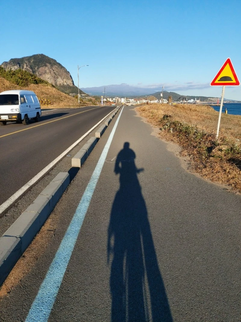 열심히 페달을 굴린다. 목욕탕 물이 효과가 있었을까... 열심히 쉬었으니 쉬지 않고 가자.. 계속되는 업힐 도로... 가다 보니 이중섭 공원도 나오고 쇠소깍도 나온다. 헉헉대며 컥컥 대며 열심히 페달을 굴렸다. 많이 왔다. 드디어 해가 저물 무렵 저 멀리 성산일출봉이 보인다. 와 드디어 끝이 보인다.