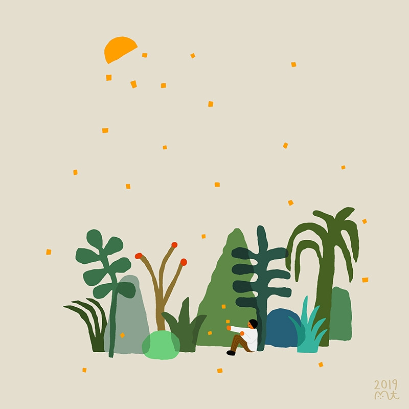 어느 날 걷다가 하늘을 올려다보게 되었다. 원래 저기에 달이 있었던가? 물론 달은 항상 거기에 있었겠지만 보이지 않던 대상이 갑자기 나타난 기분이었다. 온통 까만 배경으로 반짝이는 것은 대부분 인공적인 가로등이었기 때문에 그 사이에 걸려있는 달이 작품처럼 근사해 보였다. 밤의 나무 실루엣은 마치 그림자처럼 느껴지곤 하는데 그 너머로 달을 올려다보며, 보이지 않을 때까지 고개를 바꾸어가며 계속 보다가 뒤로 걸을 수 없어 아쉽게 작별을 하곤 했다. 달은 그렇게 보름달이었을 때 나타났다가 하루하루 조금씩 줄어들더니 반달에 가까워질 때부터는 보이지 않게 되었다. 까만 밤 새벽 공기에 달이 녹아 점점 줄어드는 것 같은 상상에 빠졌다. 마치 커피에 각설탕이 녹아 부피를 줄여가듯 알갱이들이 여기저기 흩어져 번져나가는 생각을 달을 보며 했다. 달빛이 하나씩 세상으로 내려앉아 날이 점점 밝아 오는 게 아닐까 하고. 내려앉는 달 빛 한 조각을 소중히 받아 든다.
