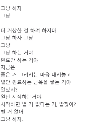 한참을 계속 써 내려간 후 잠시 메모장을 들여다보았다. 불만 토로의 장이었던 메모장이 뒤로 갈수록 점차 그냥 하자는 말로 채워지고 있었다. 스스로를 계속 달랜 끝에, 결과물의 목표 퀄리티는 최대 20%로 조정되었다. 그제야 조금 가벼워진 마음으로 창을 닫을 수 있었다.