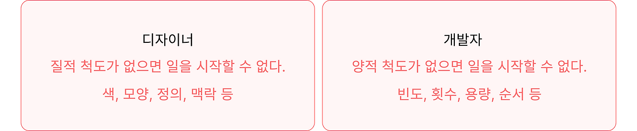 이렇게, 디자이너는 질적인 척도를 가지고 일을 하고, 개발자는 질적 척도를 양적 척도로 전환해야 일을 시작할 수 있다.
