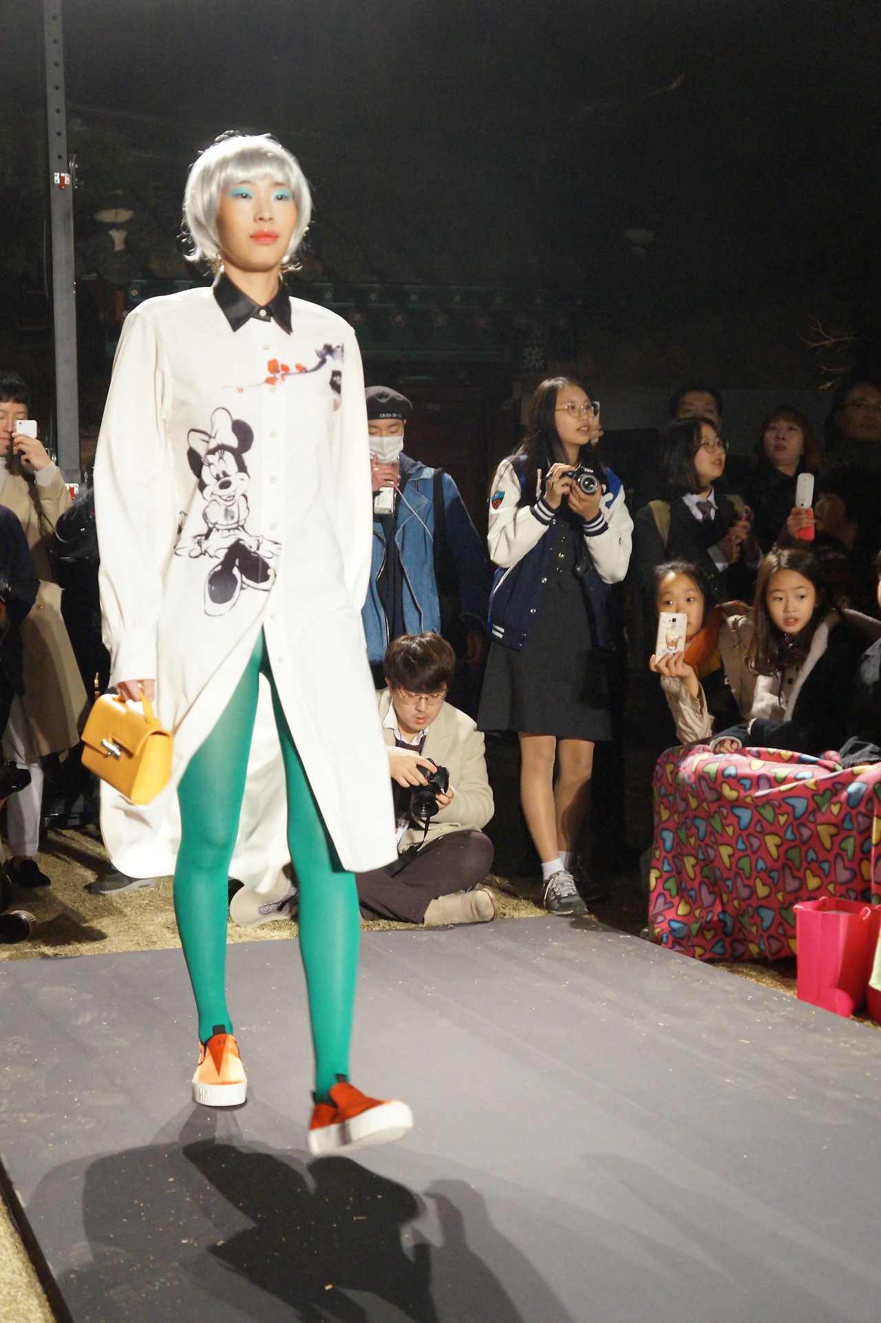 오프닝 룩은 빨간색 셔츠형 벌룬 드레스였다. 은색 단발의 헤어와 걸을 때마다 신발 위로 비치는 파란색 타이즈가 눈에 들어왔다. BNB12는 보도자료에서, 이번 시즌에는 미키마우스 등의 디즈니 캐릭터를 수묵화로 재해석한 프린트 장식과 한국 전통의 오방색을 아우를 것이라 말한 바 있다. 그 오방색들은 색색의 타이즈와 스니커즈, 루피 망고풍으로 굵고 가늘게 짠 니트 머플러 등에 팝 펑크적 느낌으로 녹아들었다.