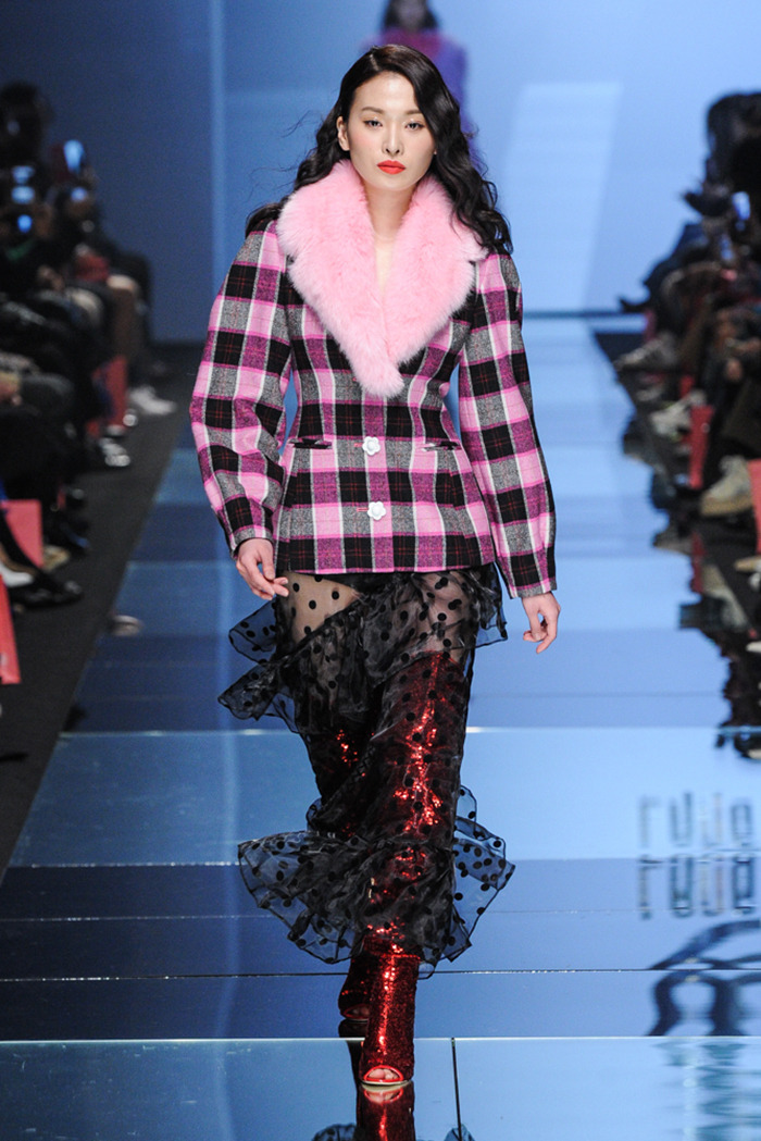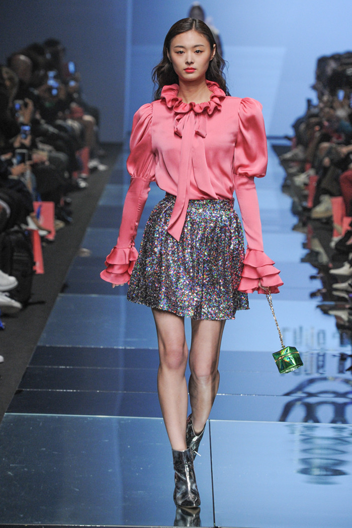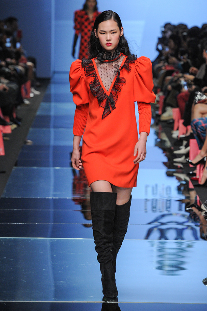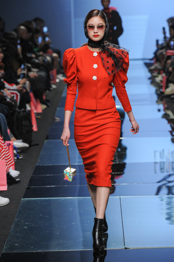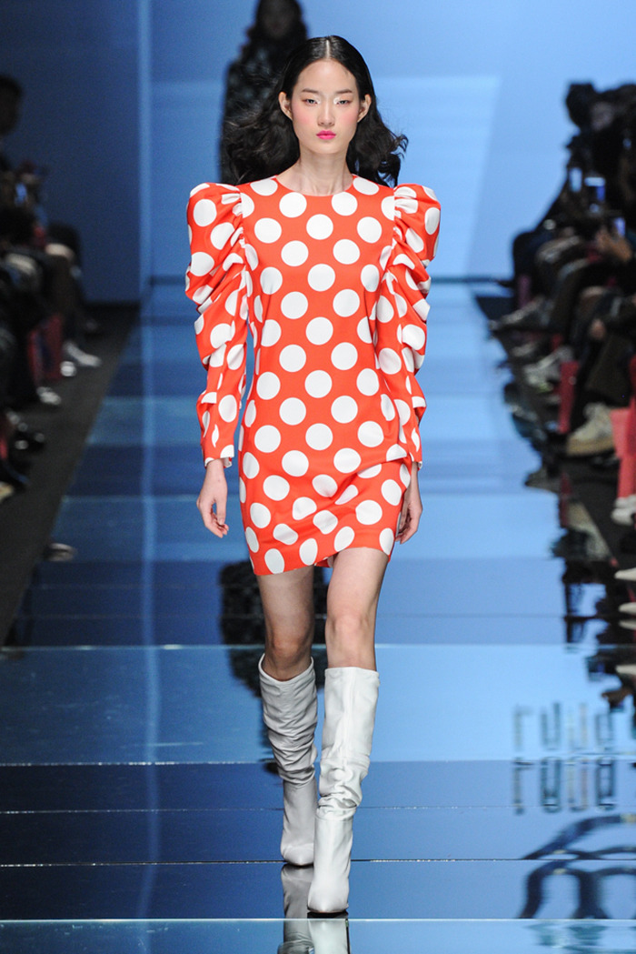 이번 쇼의 주제는 ‘첫사랑’이었다. 80년대 디스코장을 연상시키는 반짝이는 거울 재질의 블록이 깔려 있는 런웨이 위로 한껏 부풀린 레그오브머튼(Leg of Mutton) 소매의 피스들이 등장했다. 흥미로운 것은 랭앤루가 볼륨을 다루는 솜씨였다. 겉보기엔 똑같아 보이는 소매였지만, 실제로 이들은 각기 다른 방법으로 드레이핑 되었다. 도트무늬 드레스는 전통적인 세기초의 방식으로, 블랙 레이스를 댄 레드 드레스는 플리츠를 넣어 볼륨을 모으는 방식으로, 또 레드 수트는 절개를 통해 봉합하는 방식으로 재단되었다.