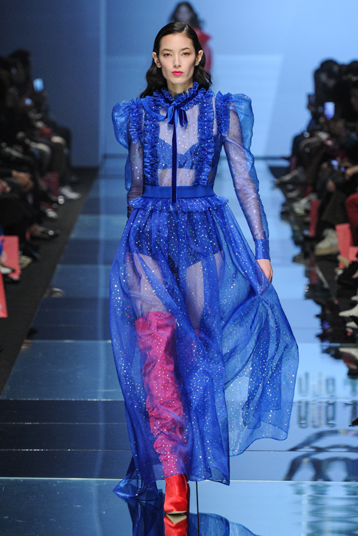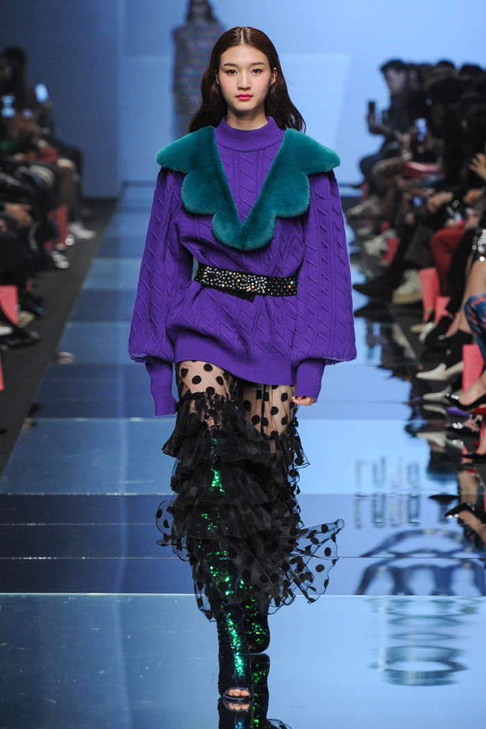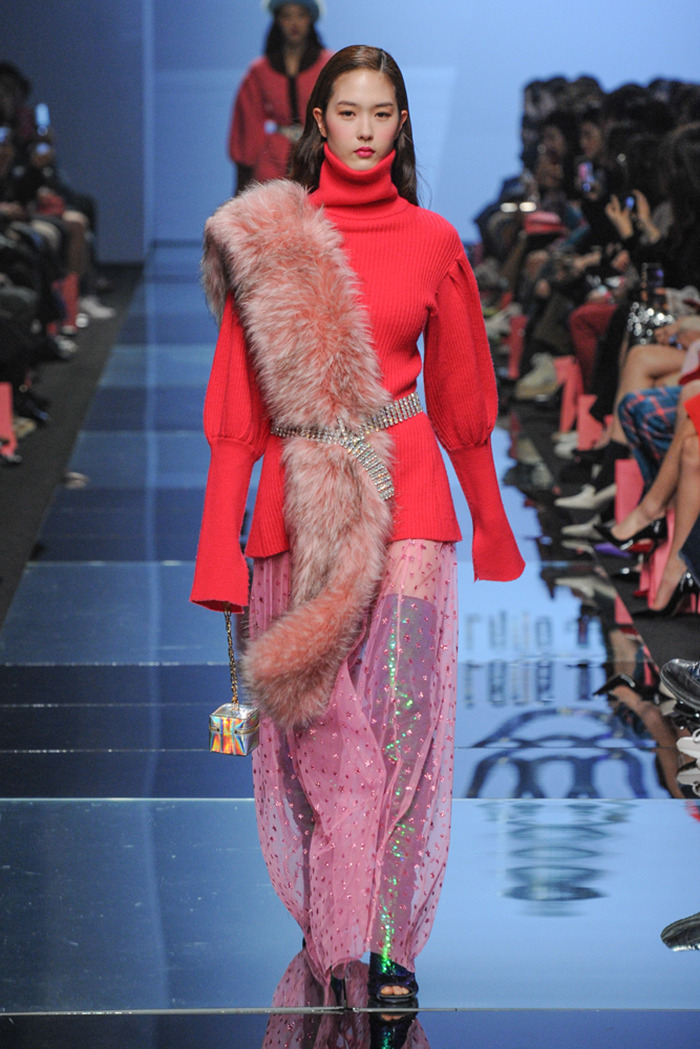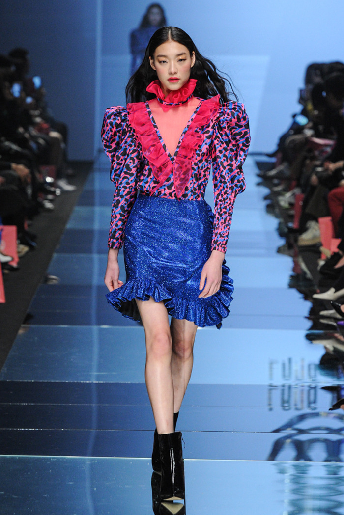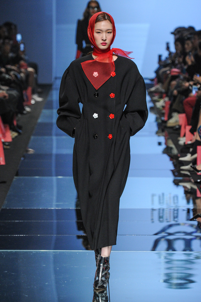 이번 쇼의 주제는 ‘첫사랑’이었다. 80년대 디스코장을 연상시키는 반짝이는 거울 재질의 블록이 깔려 있는 런웨이 위로 한껏 부풀린 레그오브머튼(Leg of Mutton) 소매의 피스들이 등장했다. 흥미로운 것은 랭앤루가 볼륨을 다루는 솜씨였다. 겉보기엔 똑같아 보이는 소매였지만, 실제로 이들은 각기 다른 방법으로 드레이핑 되었다. 도트무늬 드레스는 전통적인 세기초의 방식으로, 블랙 레이스를 댄 레드 드레스는 플리츠를 넣어 볼륨을 모으는 방식으로, 또 레드 수트는 절개를 통해 봉합하는 방식으로 재단되었다.