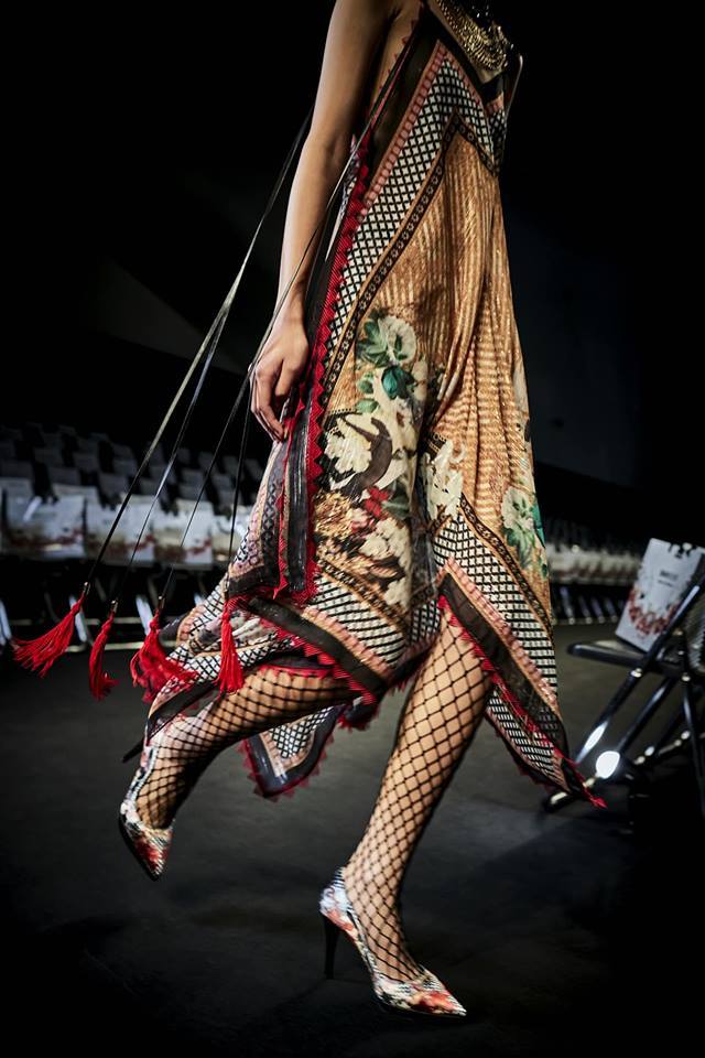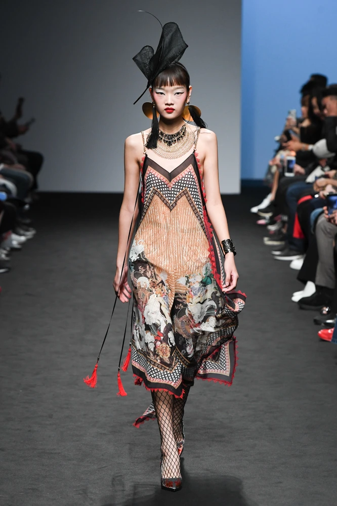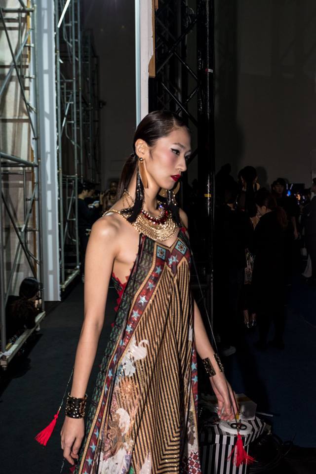 모델들은 한결같이 투박한 금색의 원반과 프린지로 제작된 거대한 이어링을 하고 있었고, 슬립가운 위로는 섬세하게 비즈들을 짜넣은 비브(bib) 스타일의 목걸이가 화려하게 빛났다. 이들은 아프리카의 마사이 부족이나 모로코 왕실의 전통의상을 오가는 모호한 이그조틱(Exotic) 무드를 자아냈다.