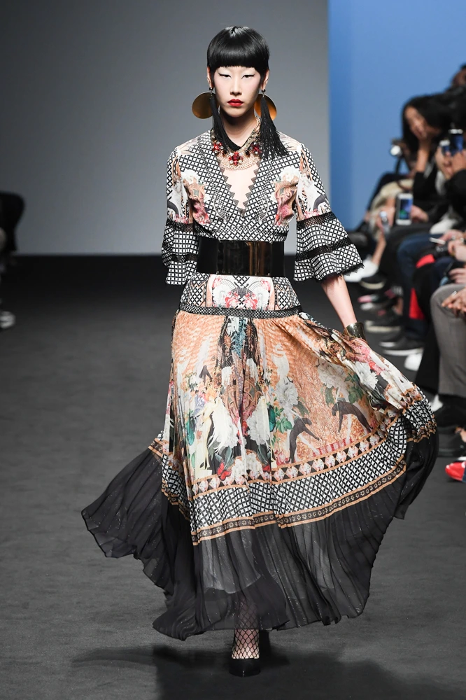 하나같이 공들여 마감된, 그리고 내년 춘하시즌 가장 강하게 부상하는 트렌드 중 하나인 보헤미안 트렌드를 겨냥한 드레스들이었다. 기모노 가운과 오프숄더 드레스, 2겹의 에이프런 드레스, 그리고 집시풍의 소매를 가진 카프탄들이 강렬한 두칸의 프린트를 만나 색다른 빛을 발하고 있었다.