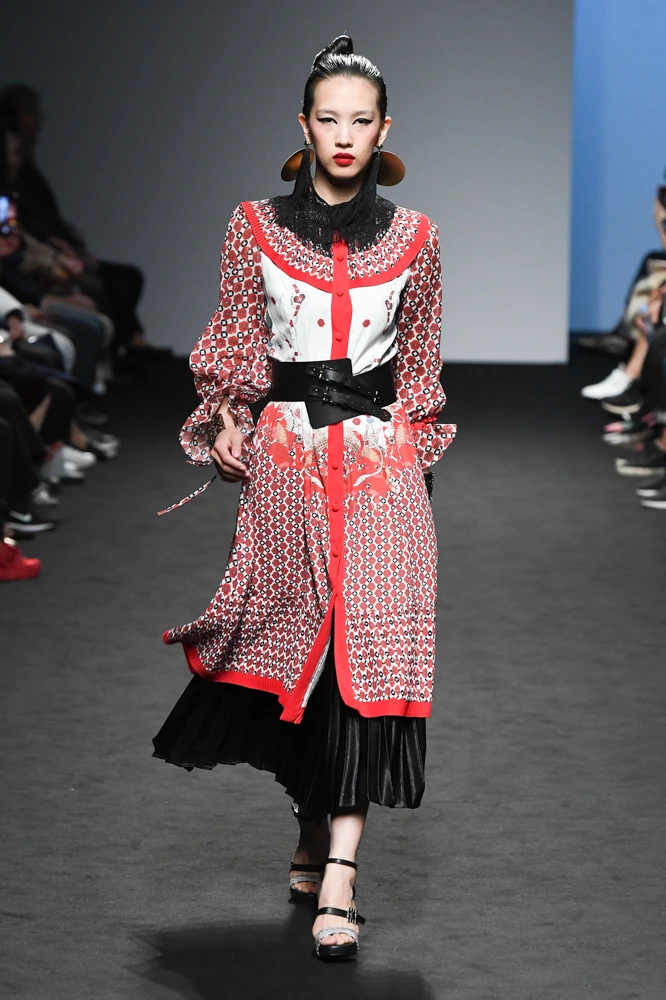 오프닝 룩은 스카프 프린트의 슬립드레스였다. 프린트 드레스가 두칸에서 이런 식으로 다루어진 적이 있었던가? 디테일 또한 극도로 정성스러웠다. 최충훈은 그 드레스의 헴라인을 레드 스칼럽으로 일일이 처리하고 레드 태슬을 달아 마무리했다.