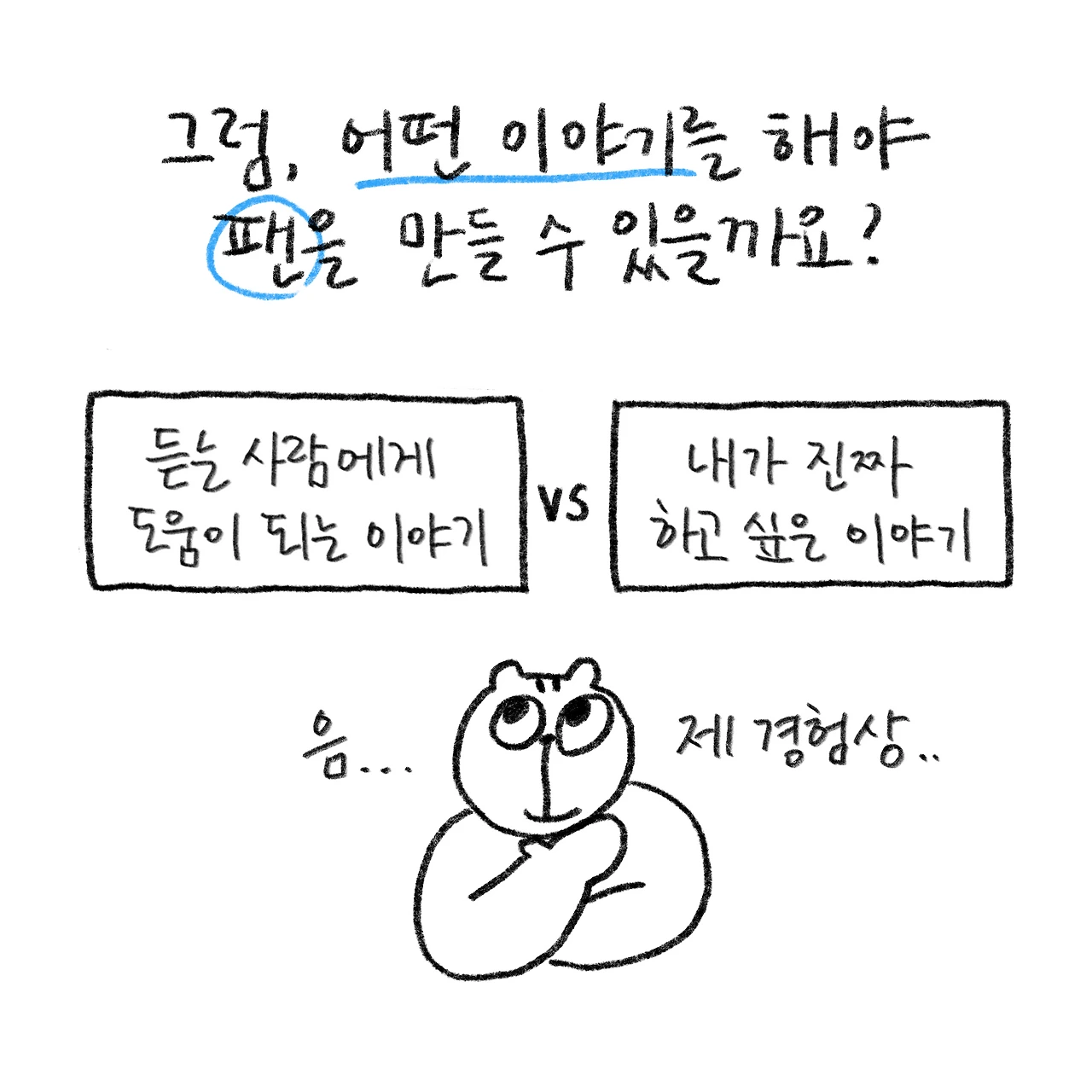 물론 돈을 벌 목적이라면 내가 관심이 없더라도 잘 팔릴 수 있는 주제를 고르는 것도 좋다. 하지만 팬을 만들고 싶다면 내가 정말로 관심이 있고, 진심을 다해 말하고 싶은 주제를 고르라고 권하고 싶다. 사람들이 좋아하는 이야기 말고, 내가 어떤 이야기를 하고 싶은 지를 먼저 생각해보자.