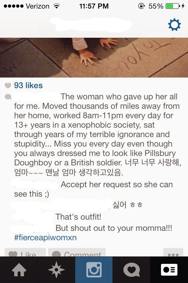 The woman who gave up her all for me. Moved thousands of miles away from her home, worked 8am-11pm every day for13+ years in a xenophobic society, sat through years of my terrible ignorance and stupidity... Miss you every day even though you always dressed me to look like Pillsbury Doughboy or British soldier. 너무너무 사랑해, 엄마~~~~ 맨날 엄마 생각하고 있음.