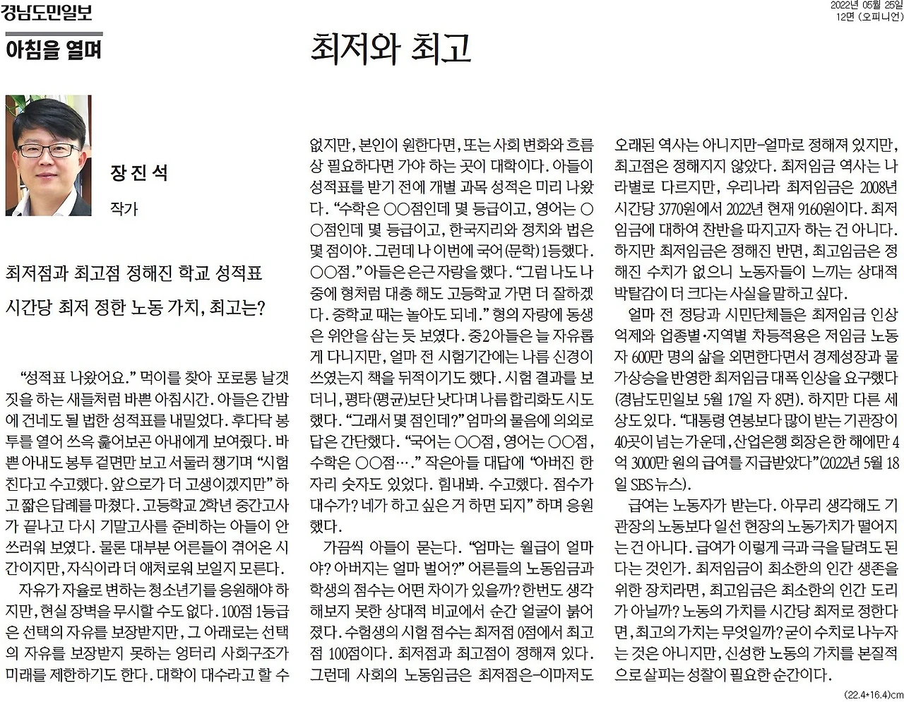 얼마 전 정당과 시민단체들은 최저임금 인상 억제와 업종별·지역별 차등적용은 저임금 노동자 600만 명의 삶을 외면한다면서 경제성장과 물가상승을 반영한 최저임금 대폭 인상을 요구했다.(경남도민일보. 5월 17일자 8면) 하지만 다른 세상도 있다. “대통령 연봉보다 많이 받는 기관장이 40곳이 넘는 가운데, 산업은행 회장은 한 해에만 4억 3천만 원의 급여를 지급받았다”(2022년 5월 18일 SBS 뉴스) 급여는 노동자가 받는다. 아무리 생각해도 기관장의 노동보다 일선 현장의 노동가치가 떨어지는 건 아니다. 급여가 이렇게 극과 극을 달려도 된다는 것인가. 최저임금이 최소한의 인간 생존을 위한 장치라면, 최고임금은 최소한의 인간도리가 아닐까? 노동의 가치를 시간당 최저로 정한다면, 최고의 가치는 무엇일까? 굳이 수치로 나누자는 것은 아니지만, 신성한 노동의 가치를 본질적으로 살피는 성찰이 필요한 순간이다.