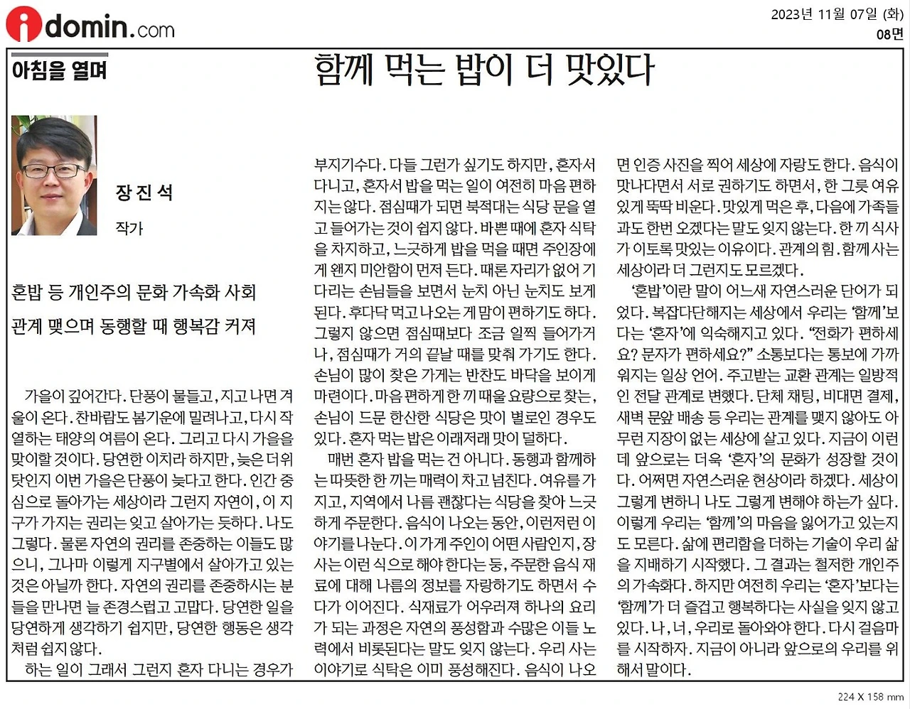 매번 혼자 밥을 먹는 건 아니다. 동행과 함께하는 따뜻한 한 끼는 매력이 차고 넘친다. 여유를 가지고, 지역에서 나름 괜찮다는 식당을 찾아 느긋하게 주문한다. 음식이 나오는 동안, 이런저런 이야기를 나눈다. 이 가게의 주인이 어떤 사람인지, 장사는 이런 식으로 해야 된다는 둥, 주문한 음식 재료에 대해 나름의 정보를 자랑하기도 하면서 수다가 이어진다. 식재료가 어우러져 하나의 요리가 되는 과정은 자연의 풍성함과 수많은 이들의 노력에서 비롯된다는 말도 잊지 않는다. 우리 사는 이야기로 식탁은 이미 풍성해진다. 음식이 나오면 인증 사진을 찍어 세상에 자랑도 한다. 음식이 맛나다면서 서로 권하기도 하면서, 한 그릇 여유 있게 뚝딱 비운다. 맛있게 먹은 후, 다음에 가족들과도 한번 오겠다는 말도 잊지 않는다. 한 끼의 식사가 이토록 맛있는 이유이다. 관계의 힘. 함께 사는 세상이라 더 그런지도 모르겠다.