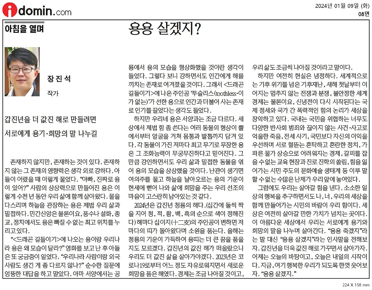 그럼에도 불구하고 우리는 살아갈 힘을 낸다. 소소한 일상의 행복을 추구하면서도 나, 너, 우리의 세상을 함께 만들어가는 시민의 바람이 우리의 힘이다. 세상은 여전히 살아갈 만한 가치가 넘치는 곳이다. 이 아름다운 세상에서 우리는 서로에게 용기와 희망의 말을 나누며 살아간다. “용용 죽겠지.”라는 말보다 “용용 살겠지.”라는 인사말을 전해보자. 갑진년을 더욱 값진 년으로 가꾸면서 살아가자. 어제는 오늘의 바탕이고, 오늘은 내일의 시작이다. 지금, 여기 행복한 우리가 되도록 한껏 웃어보자. “용용 살겠지.”