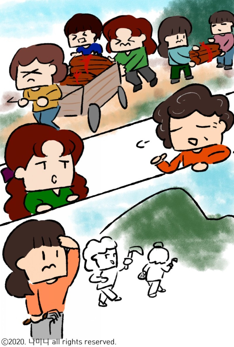 아빠가 도와주셨으면 리어카없이 지게로 져서 날라주셨을지도 모르지만, 아빠는 한 번도 나무 하는 일을 도와주시지 않았다. 아마도 아빠가 출근하신 낮시간에 해야 했기 때문이었겠지만 지금 생각해도 미스테리다. 왜 안 도와주셨을까?