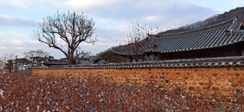 달성의 마비정 벽화마을 가는 길에 차들이 많이 주차되어 있길래 어떤 곳인가 하는 호기심에 들렀기 때문에 처음엔 이곳이 어떤 곳인지 잘 몰랐다. 주차장 바로 앞의 동상과 그 아래 쓰인 글을 보고서야 이곳이 문익점의 후손들이 사는 마을임을 알았다. 너른 목화밭을 보면서 역시 문익점의 후손답구나 하는 생각이 들었다. 다만 이 목화밭 또한 농사로서의 목적보다 보여주기용 목적이 더 큰지 목화솜이 거둬지지 않은 채 가지마다 하얗게 벙그러진 채 겨울을 맞고 있었다. 남평 문씨 세거지는 최근 한옥마을 붐을 타고 새로 생긴 곳이 아닌 이백 년 가까운 세월 동안 잘 관리되며 유지해온 기와집들이 골목골목 자리한 데다, 여전히 살림하며 사는 집들이 대부분이라 옛 부잣집들 한복판을 거닐다 온 느낌이었다. 한 집안 아홉 대소가와 재실 두 채, 인수문고와 부속건물 등 한울 안에 총 70여 채의 전통 기와집이 들어서 있다.