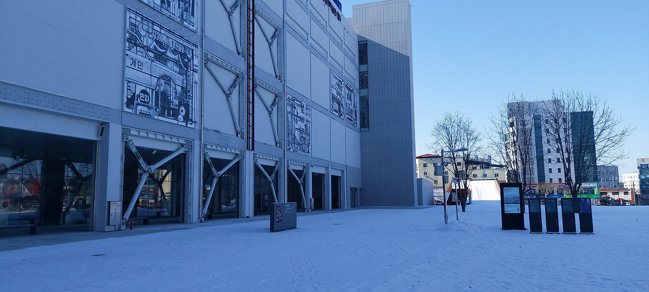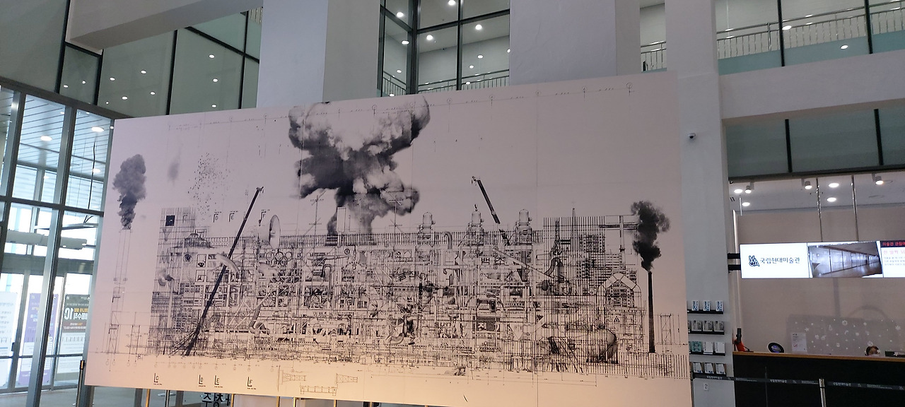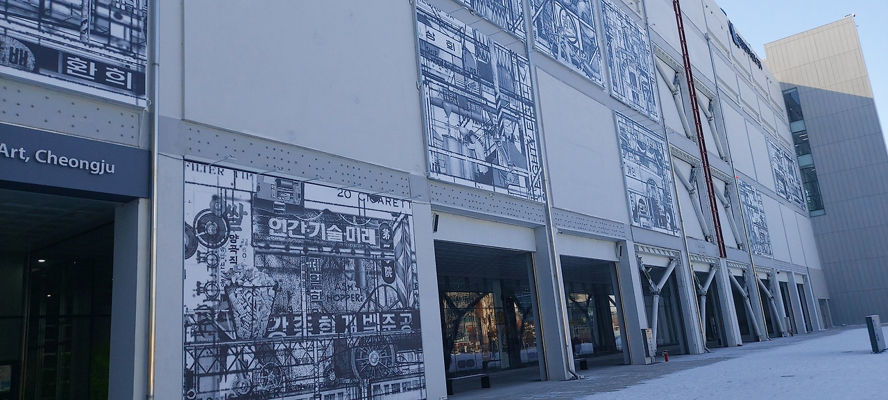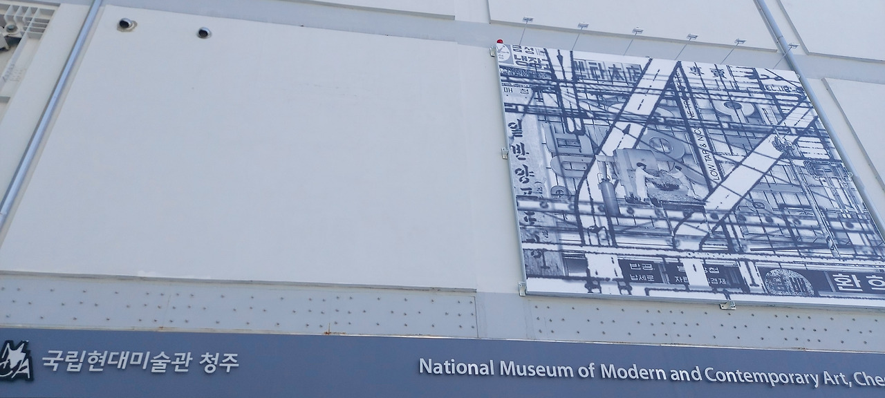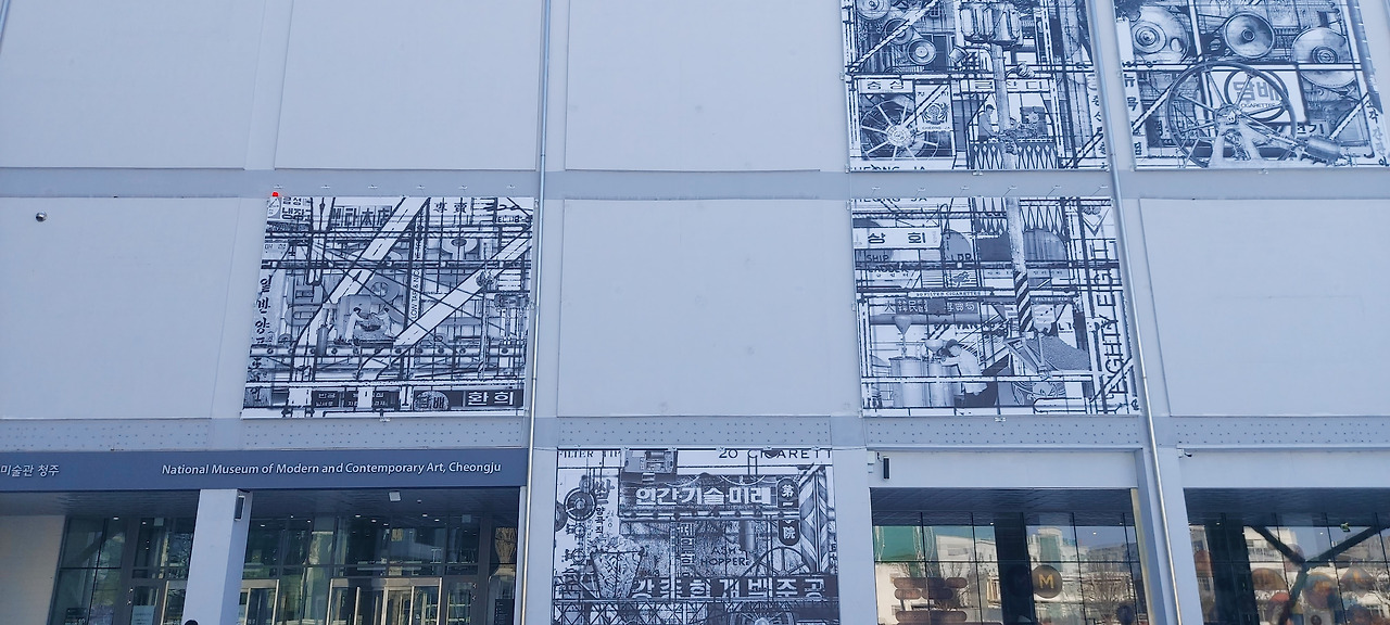 그림 보기를 즐기는 편이다. 좋은 전시가 있으면 메모해뒀다 가고, 미술관과 박물관도 정기적으로 들르곤 한다.(12년전 오늘도 서울 시립미술관의 퐁피두전과 한국구상화가전, 예술의 전당 한가람미술관의 렘브란트전, 경인미술관의 신동권 화백 전시를 가보려고 전시안내소식을 블로그에 올린 기록이 과거의 오늘로 뜬다) 어딘가 처음 가본 건물에 걸린 그림을 보면 그냥 지나치지 않고 작가와 작품명을 꼭 살피는 버릇이 있다. 한때는 미술품소장에 빠져서 그림을 사모으다 남편과 이혼할 뻔도 했다.ㅜㅜ 미술이나 화가에 관련된 책들을 읽고, 소장하는 것도 좋아해서 집안 곳곳에 있는 책장들엔 그런 책들이 가득하다. 책이 아무리 비싸다 해도 그림보다는 싸서 그나마 책 사보는 것으로 대리만족하는 중이다. 그런데 코로나가 세상을 점령하고부터 전시관이나 미술관 박물관 들이 문을 열지 않는 날들이 많아지며 이런 호사를 누릴 일도 없어졌다. 어디를 가나 '코로나로 인한 휴관'이란 표지가 붙어있기 일쑤여서 그런 곳은 아예 가볼 생각을 않게 되었다. 코로나가 진정되면서 예약제로 미리 관람신청을 하면 갈 수 있다는 사실을 알게 된 뒤에도 속속 예약이 마감되는 사태를 보며 그런 바지런을 떨 여유가 없었는데... 새해 첫 날, 남편이 어디를 갈까 하다가 날도 춥고 눈도 많이 오고 해서 멀리는 못 가고 가까운 청주 국립현대미술관이나 오랫만에 가자고 했다. 그런데 1월 1일은 휴관일이어서 다음 날인 1월 2일에 찾았다. 예약은 홈피에서 오전 10시 부터 두 시간 단위로 60명씩 받고 있었다. 우리는 12시에 예약을 했는데, 좀 일찍 도착해서 11시 40분쯤 들어갔는데도 예약명부를 확인한 뒤 바로 입장하게 해주었다. 관람객들이 많지 않으니 충분히 사회적 거리두기를 하면서 쾌적하게 관람할 수 있어 좋았다. 청주 국립현대미술관은 충청북도 청주시 청원구 내덕2동 상당로 314에 위치한 국내 최초 수장형 미술관으로 과천, 덕수궁, 서울에 이어 네 번째로 개관한 국립현대미술관이다. 청주시 연초제조창을 재건축하여 연면적 19,855㎡, 지상 5층 규모 건물로 2018년 12월 27일 개관했다. 막 개관한 무렵 온 가족이 함께 가서 보고 이번이 두 번째 방문이다. (내 기억에 따르면 세 번째인데 남편은 두 번째라고 함) 1층 로비와 외벽에서는 'MMCA 청주프로젝트 2020 권민호 : 회색 숨'이 전시중이다.(~2021.11.14) 지금까지 국립현대미술관은 각 관의 환경적 특성을 살린 다양한 프로젝트를 기획해왔는데, 청주는 넓은 야외공간을 활용해 한국 신, 중진 작가가 다양한 실험을 하고 작품을 제작할 수 있도록 지원하고자 이번 전시를 기획했다고 한다. '권민호 : 회색숨'은 건축 도면에 연필이나 목탄으로 그리고, 디지털 사진을 콜라주하여 한국 근현대사 풍경 중 특히 산업화 시기에 관심을 두고 공장, 기계, 거리의 간판 등 시대 상징물을 중첩하여 치밀하게 그려내는 권민호 작가의 신작이다. 설계 도면에서 실제 건물 외벽으로, 3D 증강현실로 확장된 '회색 숨'은 실크스크린, 설치, AR 콘텐츠 등 다양한 매체로 제작된 작품을 공감각적으로 체험하며 역사 속으로 사라진 청주 연초제조창을 기억하고, 다시 되새길 수 있는 연결 통로가 되어준다.