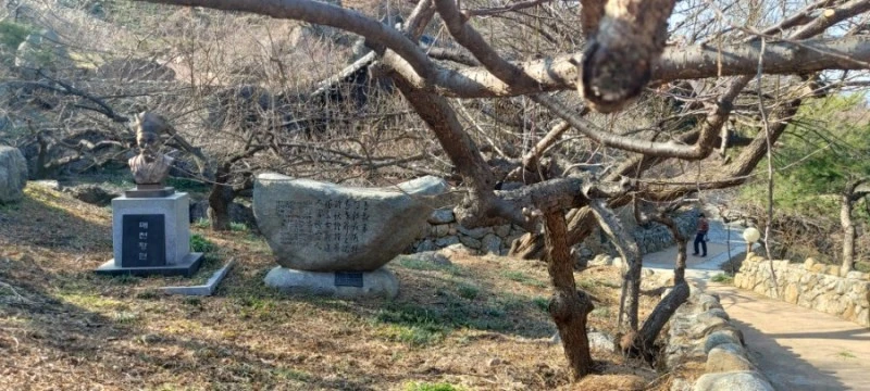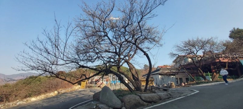 청매실농원 입구에는 오래된 매화나무 한 그루가 있다. 이 매화나무는 국가지정 매실명인 홍쌍리 여사의 시아버지이신 고 율산 김오천 옹께서 1017년에 심은 것이라고 한다. 우리나라에서는 맨 처음 청매실농원을 시작으로 이 지역은 물론 전국 각지에 매실나무가 보급되어 농가소득 증대와 국민건강 향상에 기여하게 되었고, 세상에서 제일 먼저 아름다운 꽃을 피워 많은 사람의 사랑을 받고 있으므로 청매실농원에서 보호수로 지정하고 관리하는 나무라고 한다. 아직은 때가 일러서 가지에 꽃봉오리만 자잘하게 매달려있었다.