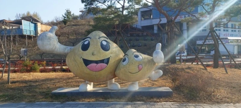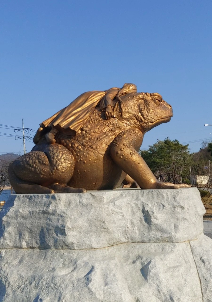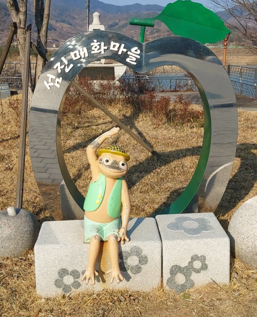 어쩐지 매화마을 홍쌍리 매실가 앞에도 두꺼비 석상 한 쌍이 나란히 있고, 공원 한가운데 커다란 금두꺼비가 여인을 업은 조형물이 있을 뿐 아니라 이곳저곳에 두꺼비 석상이 설치되어 있더라니~. 잠시 쉬었다 가라고 마련해둔 돌의자에도 앙증맞은 두꺼비가 매달려있어서 왜 그런가 했더니 섬진강이란 이름의 유래에서 비롯된 상징물들이었다.