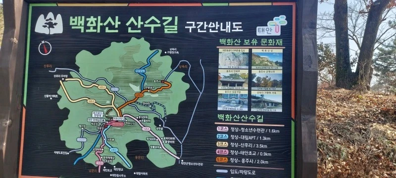 백화산은 그 자체로 '백화산 산수길'이 조성되어 있으며, 태안을 잇는 '솔향기길' 5코스가 지나가기 때문에 도보여행객들이 자주 찾는다. 특히 백화산 냉천골은 한 여름에도 서늘한 기운을 유지하는 곳이기 때문에 예로부터 주민들이 더위를 피해 찾았던 곳이라고 한다