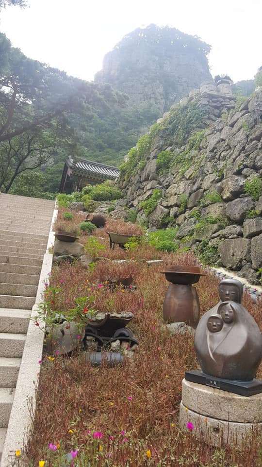 삼각우송 앞에 전망대처럼 뻗어나간 곳에 오층석탑이 마련되어 있고, 그 아래 부처님이 계셔서 불공을 드리게끔 되어 있는데 그곳에서 바라본 풍경은 그야말로 가슴이 뻥 트일만큼 시원스러웠다. 부처님 손바닥 위에 누군가 올려둔 시주쌀봉지가 웃음을 자아내기도 했다.