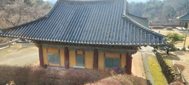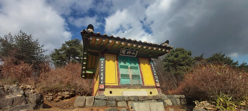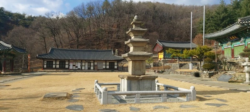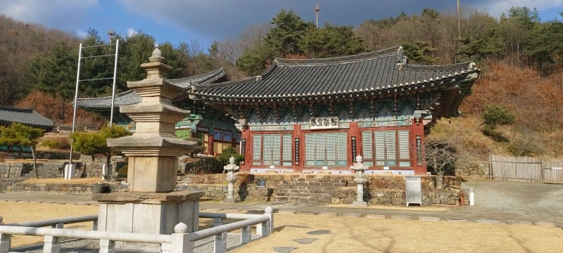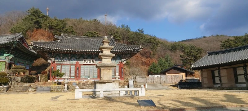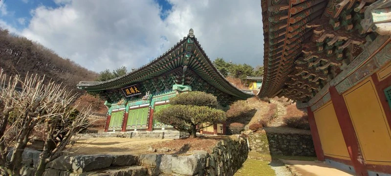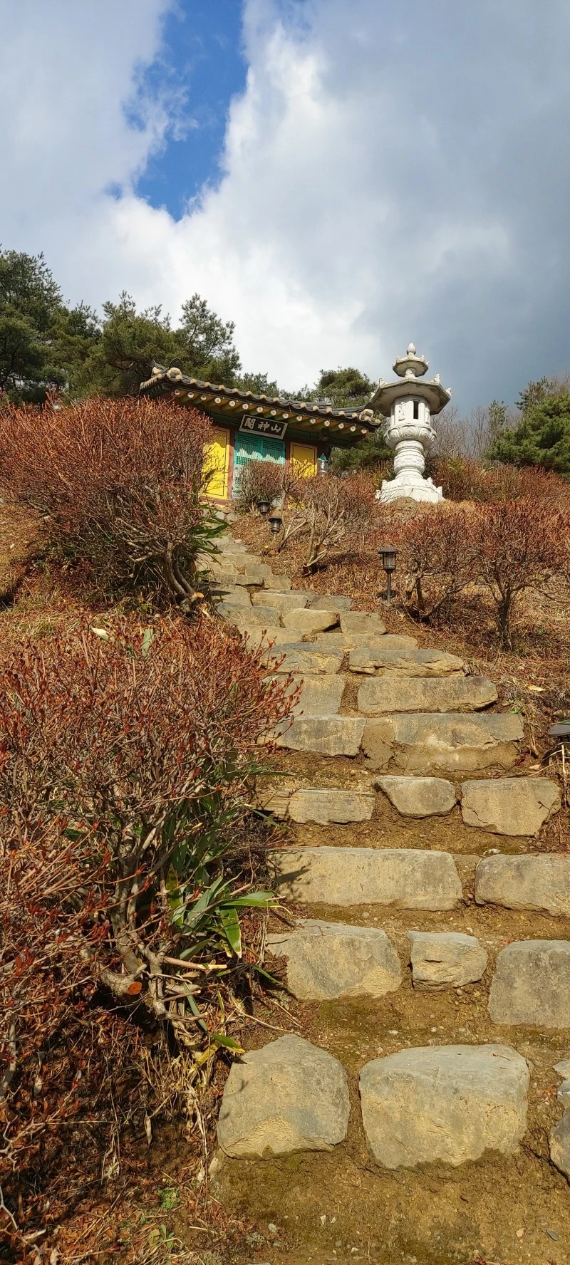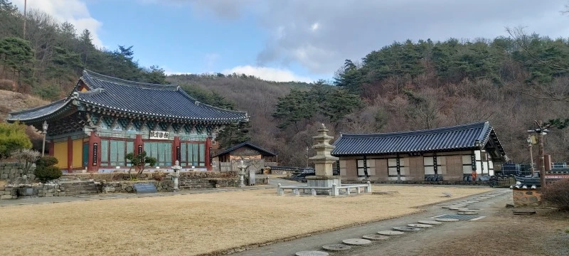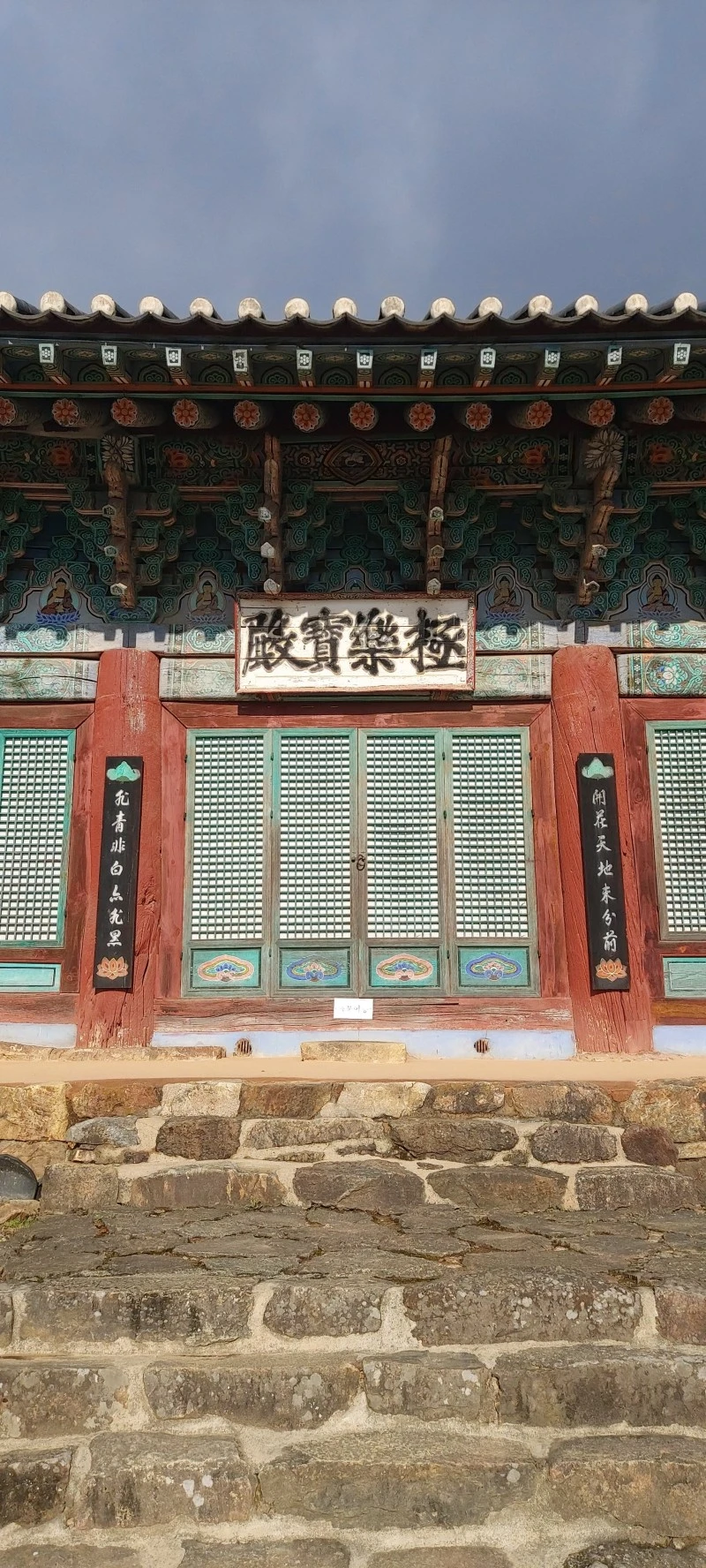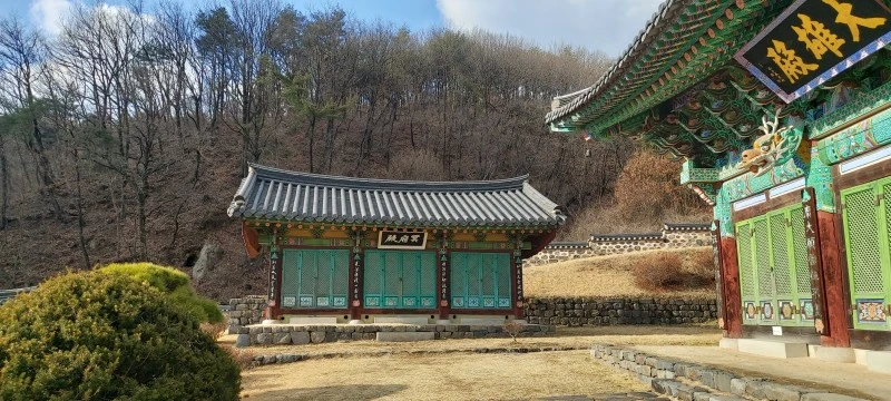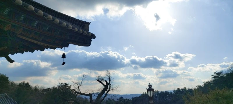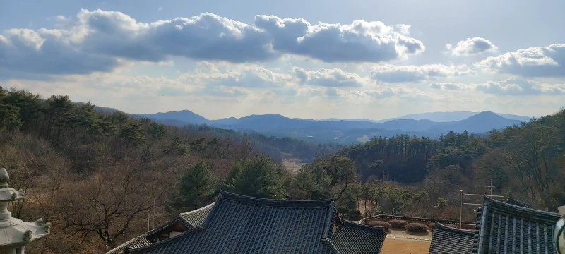 느티나무 앞을 지나 절 마당에 서면 삼층석탑과 극락보전, 대웅전, 설선당과 명부전이 자리한 단촐한 사찰 경내가 한눈에 들어온다. 극락보전과 대웅전 사이 계단으로 올라가면 산신각이 나오는데, 산신각 앞에 서면 멀리까지 확 트인 전망이 보인다. 그 날은 하늘을 둥둥 떠다니는 구름 사이로 빛내림이 멋진 날이어서 더더욱 전망이 좋았다.