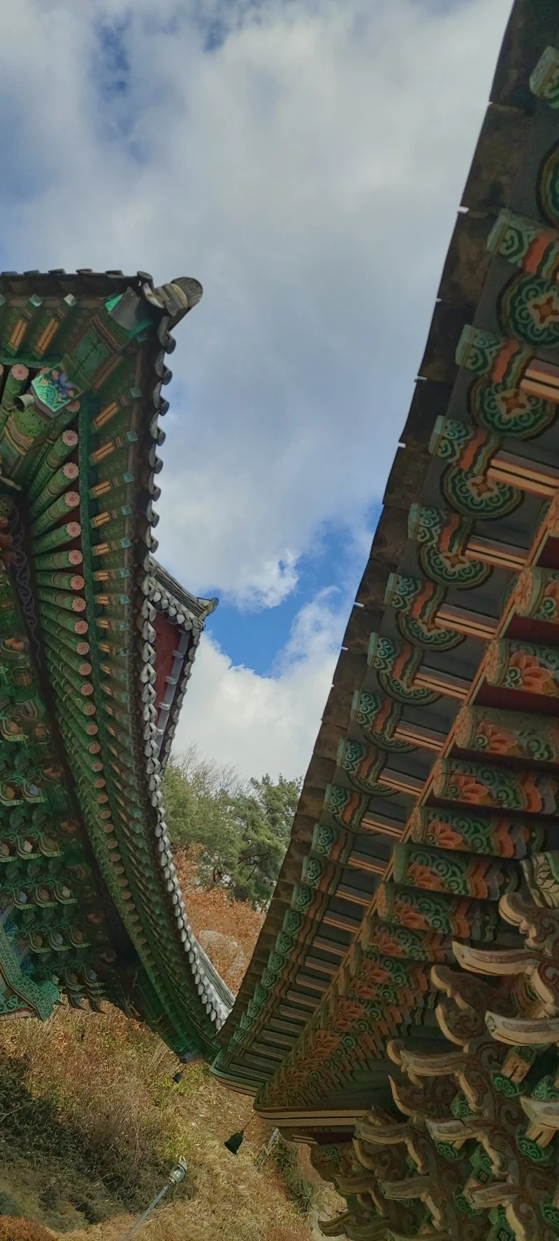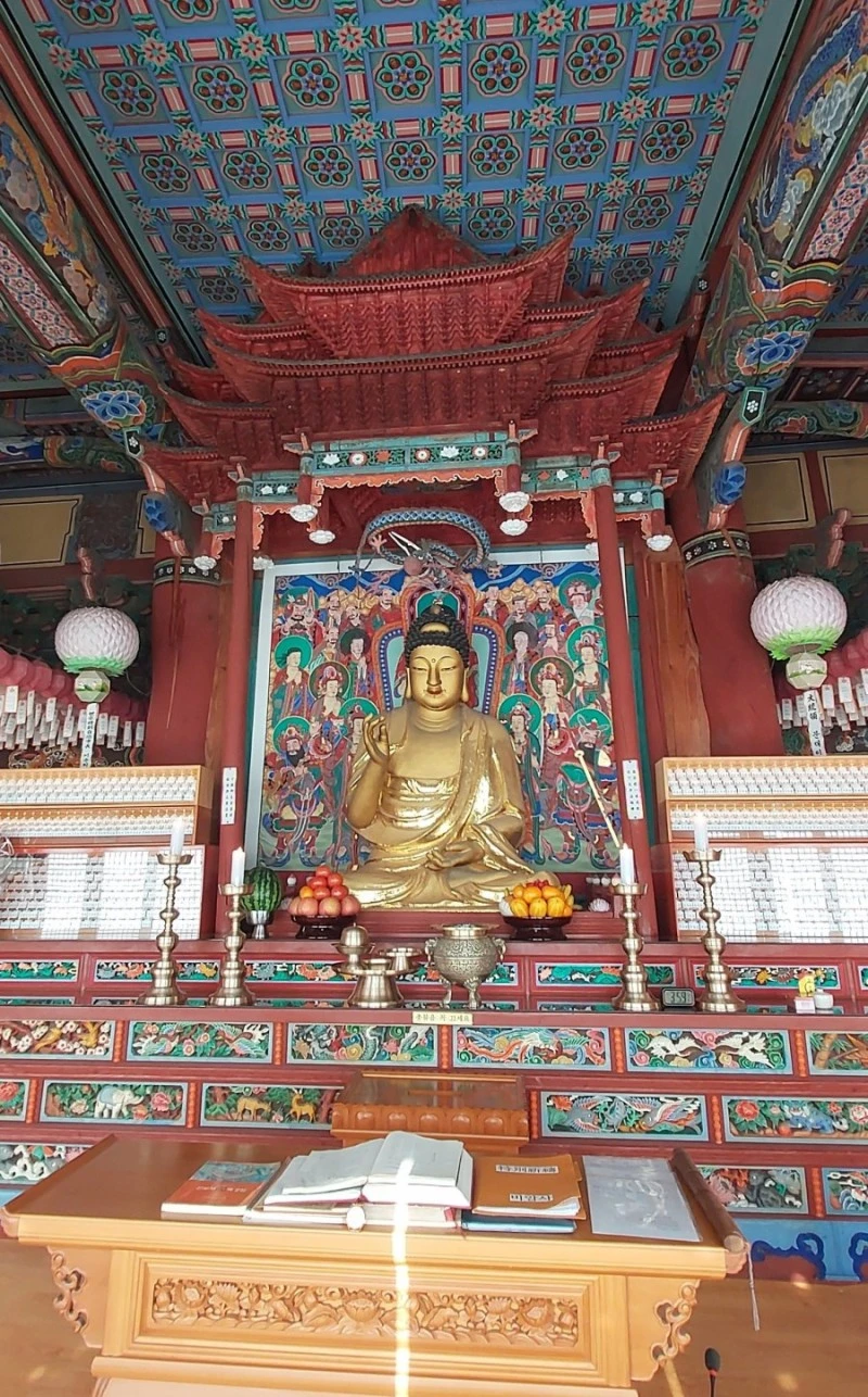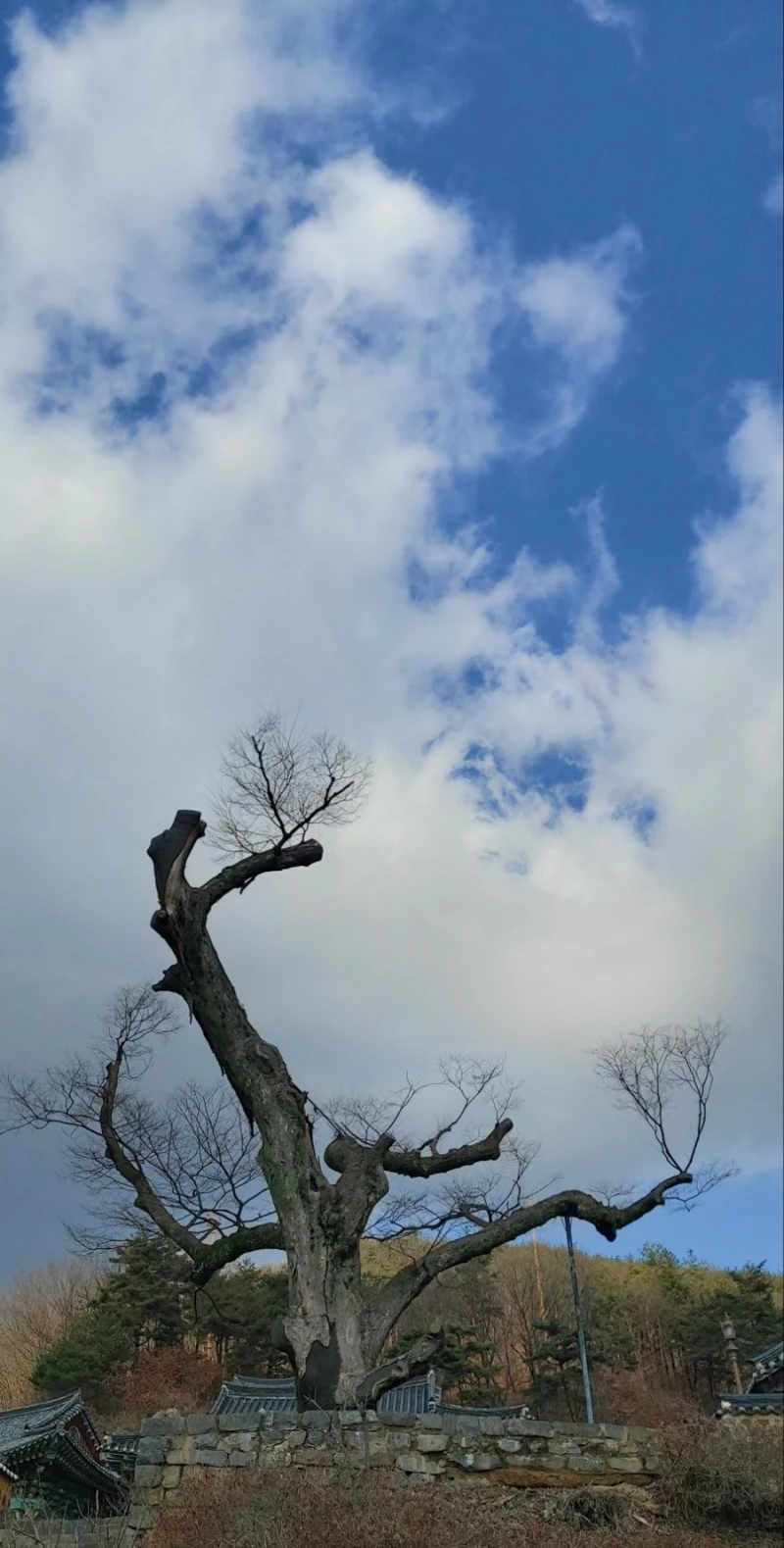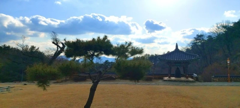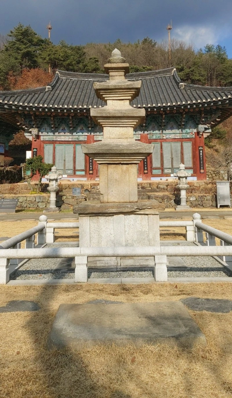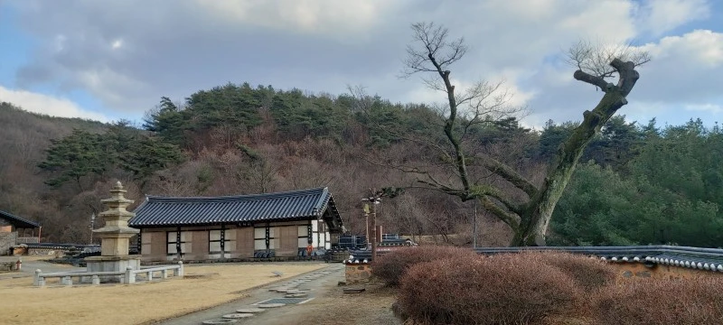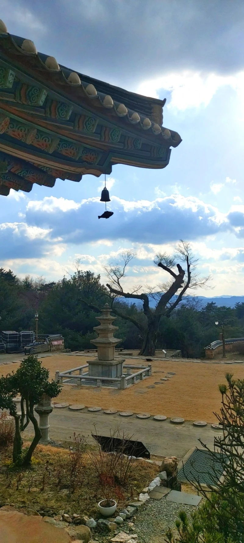 느티나무 앞을 지나 절 마당에 서면 삼층석탑과 극락보전, 대웅전, 설선당과 명부전이 자리한 단촐한 사찰 경내가 한눈에 들어온다. 극락보전과 대웅전 사이 계단으로 올라가면 산신각이 나오는데, 산신각 앞에 서면 멀리까지 확 트인 전망이 보인다. 그 날은 하늘을 둥둥 떠다니는 구름 사이로 빛내림이 멋진 날이어서 더더욱 전망이 좋았다.