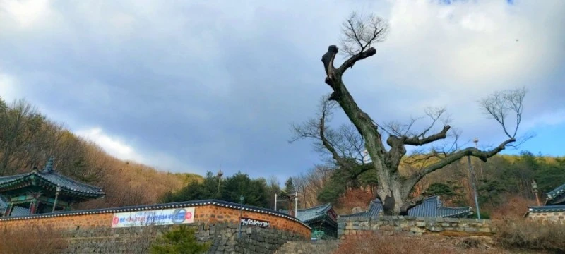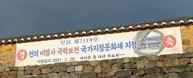 대전과 지리적으로 가까워서 아이들이 어릴 때부터 휴일이면 가족과 함께 종종 찾던 작은 절에 2021년 2월 23일, 반가운 소식이 들려왔다. 문화재청이 세종시 전의면에 있는 시 유형문화재 '비암사 극락보전'(碑巖寺 極樂寶殿)'을 보물 제2119호로 지정했다는 것이다. 세종시 건축문화재로는 처음으로 보물로 지정된 경사라고 한다. (지정일자는 2월 26일) 세종시는 2012년 특별자치시 승격 이후 건축문화재로는 처음으로 비암사 극락보전을 국가지정문화재 보물로 신청하였고, 문화재위원회에서 가치가 충분하다는 판단에 따라 이번에 보물로 지정하게 되었단다. 갈 때마다 무심코 지나친 극락보전이 보물로 승격했다니 또 가볼 이유가 생겨서 벼르다가 3월 어느 햇빛 좋은 날 오후 비암사로 향했다. 절 입구 주차장에 차를 세우고 내리면 860년 된 거대한 느티나무가 내려다보며 두 팔을 벌려 반기는 모습으로 맞아준다.(보호수 지정일 기준 수령 810년인데, 지정일이 1972년이다) 나무 맞은편 담장에 극락보전의 보물 지정 소식이 담긴 현수막이 걸려있고, 볼 때마다 웃음 짓게 되는 <아니 오신듯 다녀가소서> 글씨가 보인다.