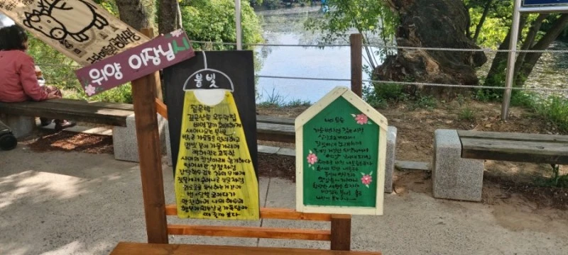 코로나시대에 줄줄이 취소되는 지역축제들이 대부분인데 이렇게 꾸준히 명맥을 유지하려는 점은 가상하지만 너무 많은 인원이 몰리는 탓에 좀 걱정스럽기도 했다. 주차장시설을 위양못 입구에 마련해놓은 것 같긴 한데, 아직 그곳이 이용불가인지 그곳은 텅텅 비어있고, 도로를 쭉 따라 차를 주차해야 해서 더 교통난이 가중된 듯했다. 11회째나 이어져온 축제라면서 기반시설이 제대로 준비되어있지 않은 점은 아무래도 이해가 안 되는 부분이었다. 또 정자에서 보기로 오른쪽 맞은편 산아래 부분은 고인 물이 썩었는지, 산책로에서 안좋은 냄새가 나기도 해서 눈살이 찌푸려지기도 했다. 주변 농지에서 뿌린 거름냄새인지도 모르겠으나, 잠시 당황했다.