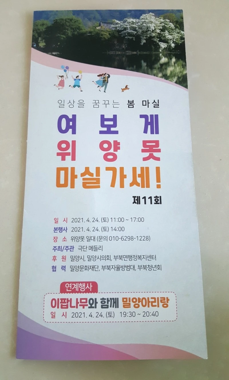그런데 코로나 이후 차량의 줄이 길게 늘어서서 정체된 풍경을 거의 보지 못했건만, 작년 가을 거창 감악산에 보라색 감국 보러 산에 올라가는 길에서 정체를 겪은 이후 두 번째로 차량통행이 힘들었다. 알고보니 밀양시와 시의회, 부북면행정복지센터에서 후원하는 '여보게 위양못 마실 가세!'라는 행사가 4월 24일 토요일 저녁 19:30~20:40까지 예정되어 있었는데, 내가 딱 그날에 그곳을 찾았고 그때문에 그 행사까지 더해져 꼬리에 꼬리를 문 차량들이 줄을 잇고 있었던 것이다.